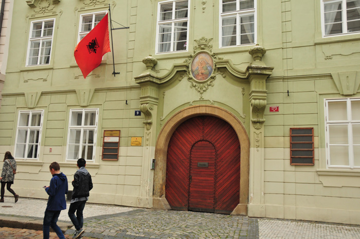 Wir waren auf dem Weg hinauf auf den Hradschin, immer wieder tief beeindruckt von den barocken Gebäuden, die gerade am Weg hinauf in die Burgstadt heute von vielen Botschaften genutzt werden, hier im Bild Albanien.