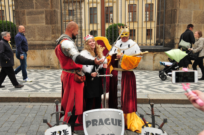 Natürlich sollte auch das touristische Foto in der Gruppe nicht fehlen, so zumindest die Idee des Königspaares in diesem Bild, schnell waren die Kostüme angelegt. Für uns ging es weiter in Richtung Hradschin Gärten.