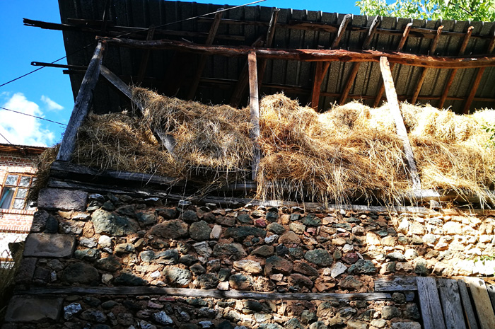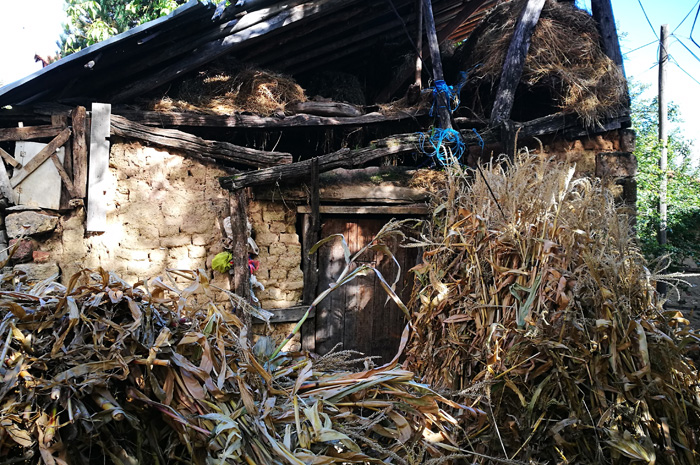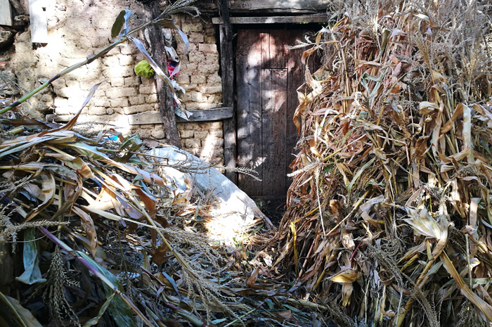 In großen Garben lose aufgestellt, werden die getrockneten Maispflanzen später neben dem Heu und Stroh unter den teilweise offenen Dächern eingelagert.