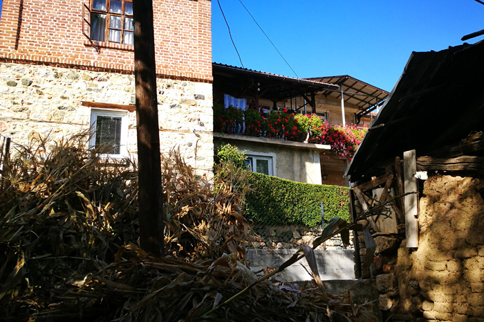 Neben den roten Paprika, Zwiebeln und Knoblauch wird auch der Mais zum Trocknen an den Balkonzaun gehängt, liegen große Haufen Brennholz für den Winter bereit.