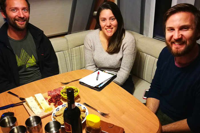 So gibt es Käse aus Frankreich, Griechenland und der Türkei, Knäckebrot aus Schweden, Brot aus Griechenland, dazu Sekt (dem Anlass entsprechend) und Filterkaffee und Tee. Hier sind als Gäste Ruth aus Neuseeland und Spitzbubi (mit seinen Wurzeln in Rumänien) dabei.