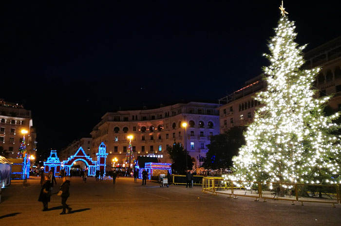 Zwar nicht winterlich aber dafür doch noch sehr weihnachtlich zeigte sich Thessaloniki bei unserem abendlichen Rundgang mit Camperfreunden aus Australien, Deutschland, Rumänien, Bulgarien und Neuseeland, so genossen wir den Abschiedsabend in der dekorativ beleuchteten Innenstadt.
