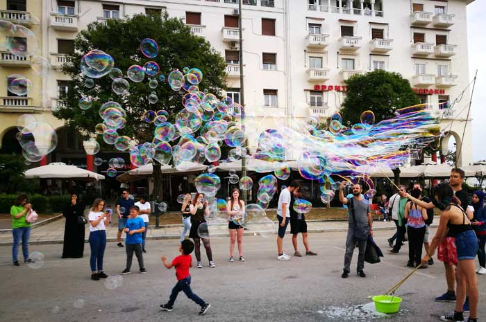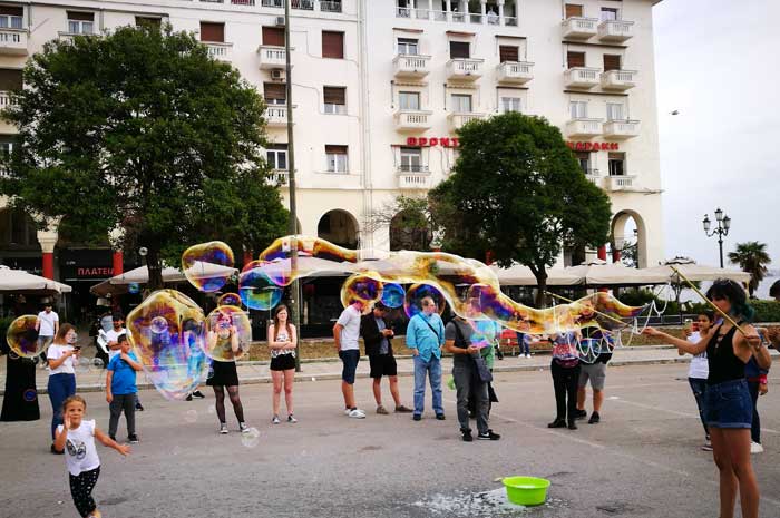 Weitere Einkäufe in Thessaloniki hatten uns von der Agora kommend bis zum Aristoteles Platz gebracht, wo wir auf dieses französische Pärchen trafen, die mit ihren Seifenblasen die Kinder zu lauten Begeisterungstänzen in den Blasen ermunterten.