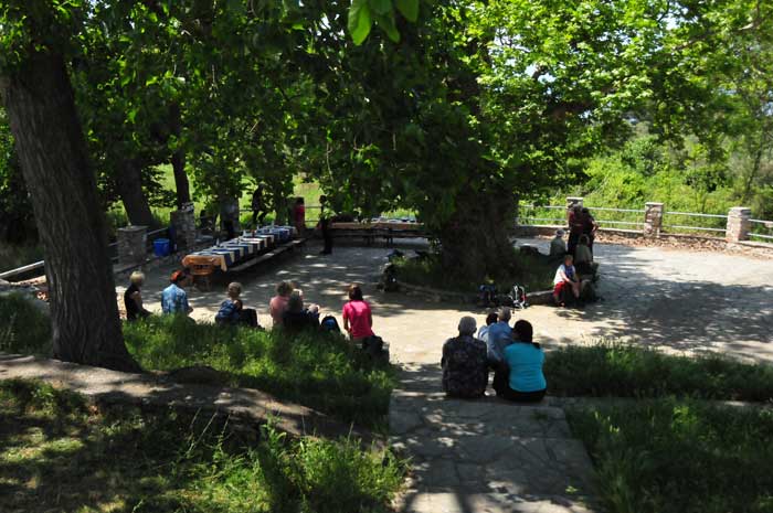 Erstmals allerdings trafen wir an der Quelle auf die geöffnete Tür der kleinen Kapelle, so das wir zumindest einen kleinen Einblick in das Innere nehmen konnten. Der Grund hierfür war wohl die Anwesenheit einer deutschen Wandergruppe mit griechischer Tourleitung, die sich den idyllischen Ort als Piknickstandort gewählt hat.