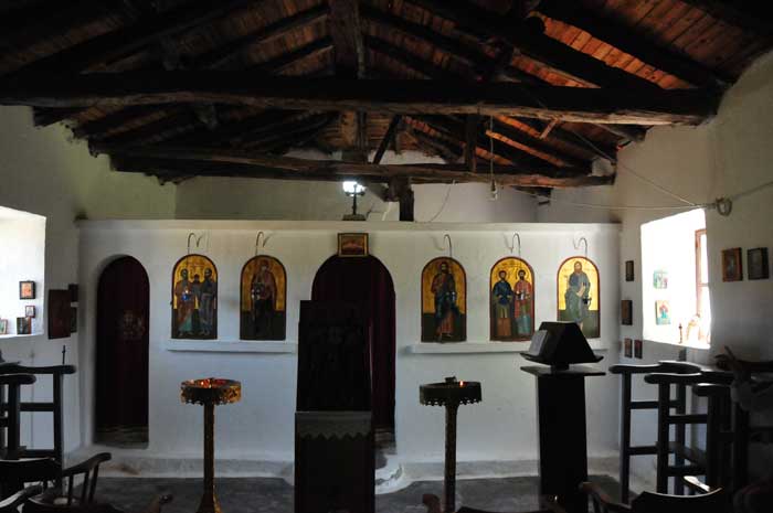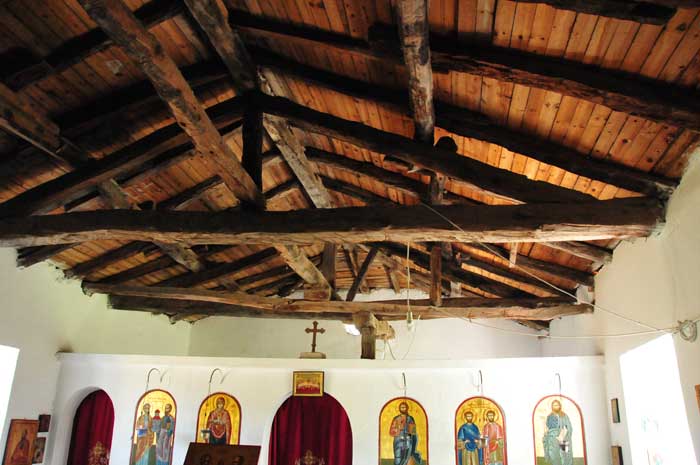 Der Blick in den Dachstuhl der Kapelle zeigt seine behauenen, ansonsten Natur belassenen Deckenbalken, darunter eine Reihe von Bildikonen an der Wand zum Altarraum.