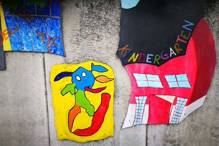 Nein, ganz im Gegenteil. Hier waren Arbeiten eines lokalen Kindergartens als Initiative schönerer Fassaden platziert worden, die auf diese Art und Weise die triste Wandfläche gestaltete und parallel auch den Kindern einen "Wert" ihrer Arbeiten vermittelten.