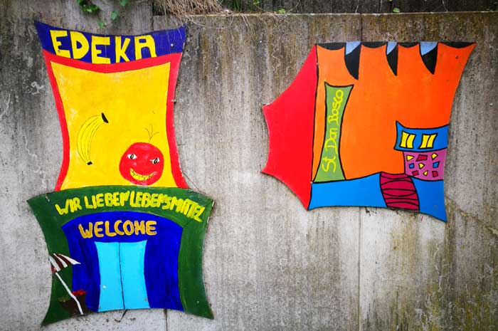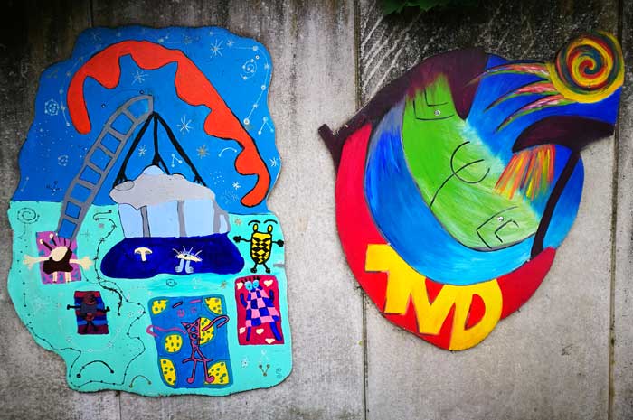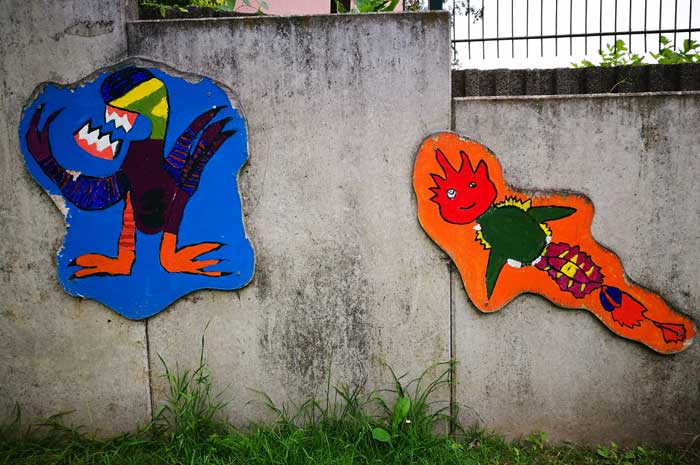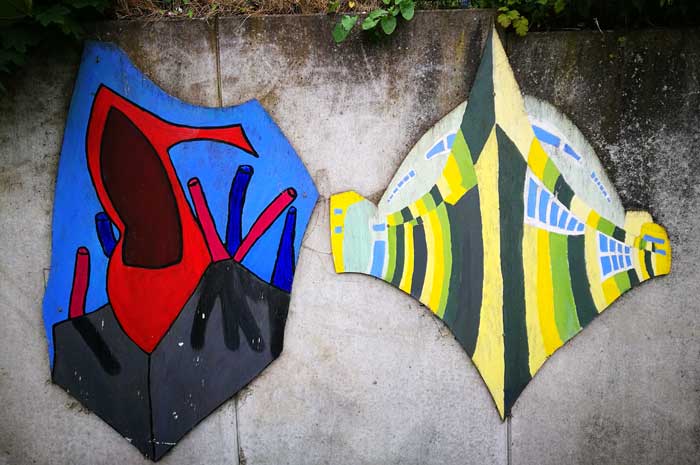 Natürlich war unser Blick unmittelbar auf die vielen Wandbilder gerichtet, die hier auf Plattenwerkstoffen gemalt, die triste Betonfassade erheblich freundlicher zu gestalteten halfen.