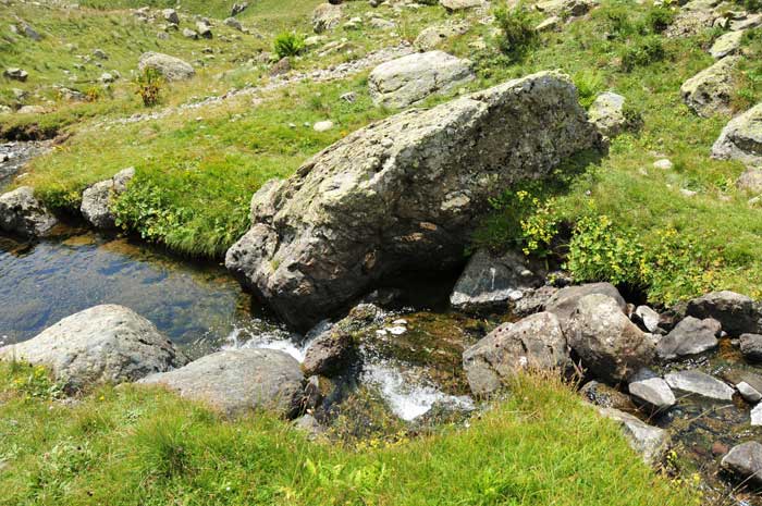 Oberhalb der Baumgrenze gelangten wir an den kleinen Bachlauf, der trotz des heißen Sommers noch immer viel Wasser führte und dem wir weiter hinauf folgten.