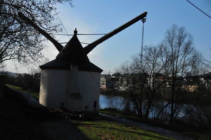 Wieder einmal in Trier unterwegs, lockte uns die Sonne zu einem Spaziergang entlang der Mosel, wo wir auf den Moselkran stießen, der in der alten Schreibweise mit "h" geschrieben und vor Ort mit Alte Krahnen bezeichnet wird.