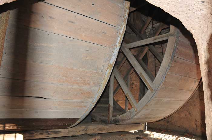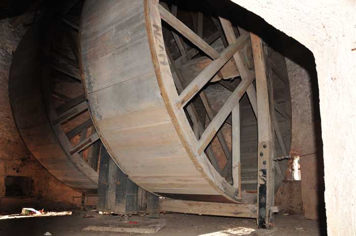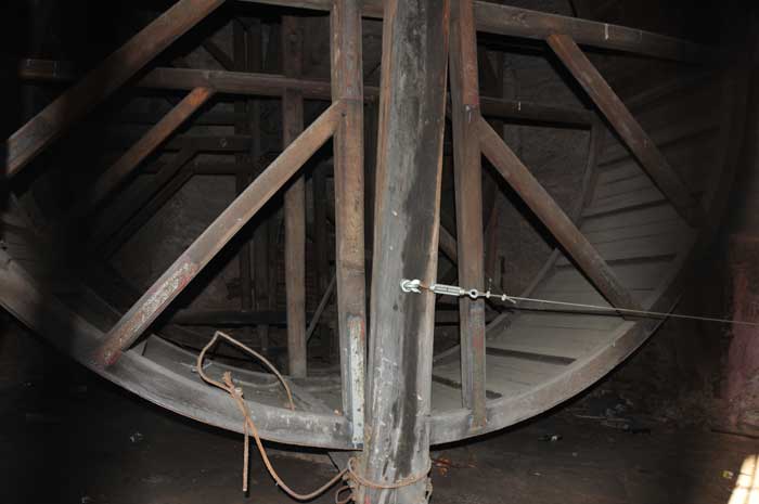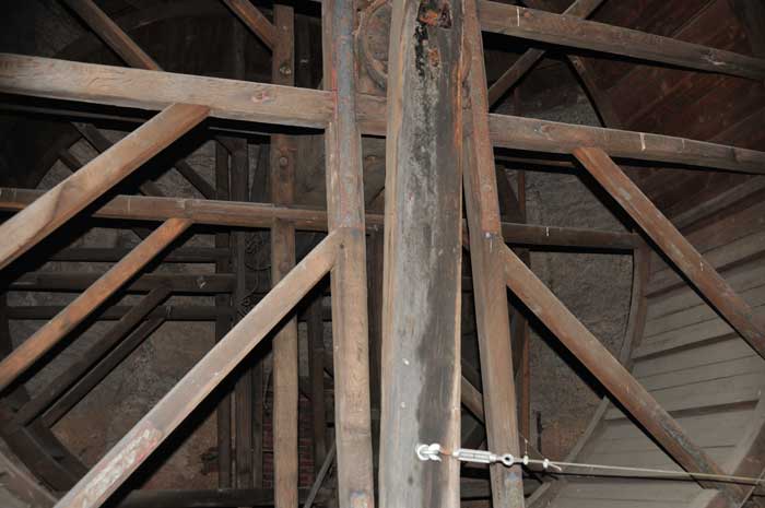Das drehbare Kegeldach verfügt über eine vertikale Holzachse („Kaiserbaum“, 12 m) auf Eisenzapfen und Kettentrommel mit Kette und einfachem Flaschenzug.
