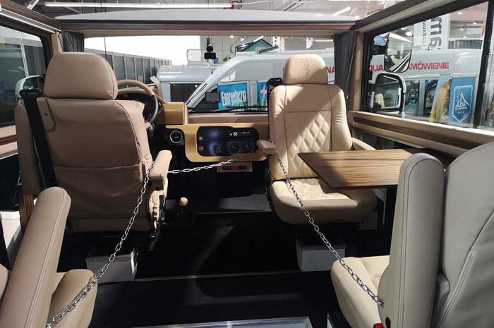 Doch nun zurück zum Skydancer, einem auf den ersten Blick von außen, normalen Wohnmobil, auf das wir am Stand des Camper-Magazins Polen aufmerksam geworden waren. Schon im Design der Frontparty aber doch große Unterschiede zu den herkömmlichen Modellen aufwies.