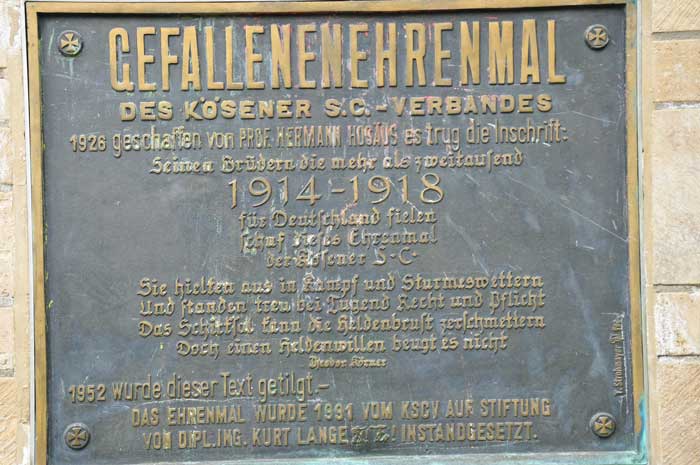 Das im Jahre 1926 errichtete Löwendenkmal noch unterhalb der Rudelsburg erinnert an die 2.360 während des Ersten Weltkrieges gefallenen Corpsstudenten. Es zeigt als Relief einen Löwen welcher von zahlreichen Lanzen getroffen wurde. Gestaltet wurde das Denkmal von dem Berliner Bildhauer Hermann Hosaeus.