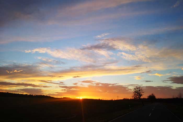 Es waren nur noch wenige hundert Meter bis nach Hause. Wohl auch angenehm erschöpft nach unserer Tageswanderung, bemerkten wir den gerade bevorstehenden Sonnenuntergang mit der Wolkenpracht erst spät.