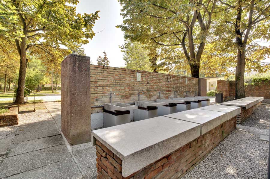 Der Campingplatz, der an der Lagune liegt, bietet ein Restaurant, eine Bar und einen Supermarkt. Zur Verfügung stehen überschattete Zelt- und Stellplätze mit Anschlüssen. Es sei daneben daran erinnert, dass der Architekt Carlo Scarpa den aus drei Funktionseinheiten bestehenden Campingplatz im Jahr 1957 geplant hat: ein Eingangsgebäude, ein Gebäude für den Bar- und Restaurantbetrieb sowie den Waschraum-Block. Carlo Scarpa gehörte zu den wichtigsten Vertretern der von Frank Lloyd Wright beeinflussten organischen Architektur in Italien. Durch seine Lehrtätigkeit, aber auch durch seine Entwürfe und Projekte prägte er die Architektur des 20. Jahrhunderts. Insbesondere durch das additive Fügen des Neuen zum Alten setzten Scarpas Bauten im Umgang mit einer historischen Bausubstanz neue Maßstäbe, die später auch für deutsche Architekten von Bedeutung waren.