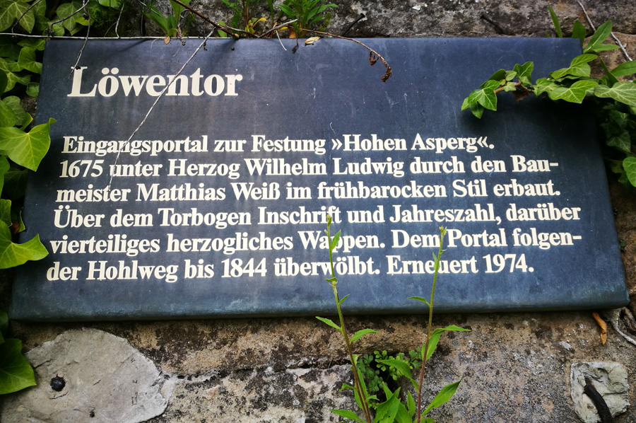 Nach dem Dreißigjährigen Krieg ging die Festung wieder in württembergischen Besitz über. Im Jahr 1675 ließ Herzog Wilhelm Ludwig das Eingangsportal zur Festung, das Löwentor, im Stil des Frühbarock als einzigen Zugang zur Festung errichten. Über dem Torbogen befindet sich eine Inschrift, die Jahreszahl und das vierteilige herzogliche Wappen. 1688 und 1693 wurde der Hohenasperg durch französische Truppen besetzt, danach verlor die Anlage ihre Bedeutung für die Landesverteidigung und wurde Garnison und Staatsgefängnis. 1718 wurde Asperg in das Oberamt Ludwigsburg eingegliedert, aber bereits 17 Jahre später wieder Sitz eines eigenen Amtes. 1781 erfolgte dann die endgültige Eingliederung in das Oberamt Ludwigsburg.