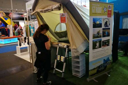 Das GT-Roof war uns schon während der letzten Messe in Stuttgart als eine besonders leichte und damit für fast jeden Fahrzeugtyp einsetzbare Dachzeltkonstruktion aufgefallen, denn mit nur 25 Kilogramm Eigengewicht ist das GT-Roof zur Zeit das leichteste Dachzelt der Welt. Natürlich wird auch beim GT-Roof die schon mehrfach beschriebene Luftschlauchtechnik Anwendung, die so immens zur Leichtigkeit (ohne Zeltgestänge) und der damit verbundenen schnellen Aufbauzeit beiträgt. Nicht zuletzt wird auch der Zeltboden, der hier beim Dachzelt auch tragende Funktion übernimmt, wie ein Stand-up Surfboard in Dropstitch-Bauweise aufgeblasen, ja, der innere Aufbau ist sogar vergleichbar.