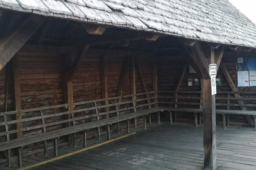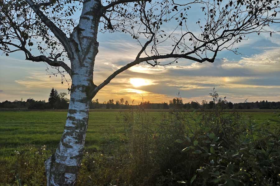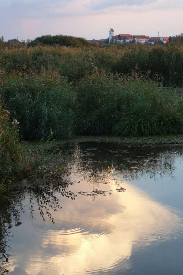 Schon während des Rundgangs wiesen Straßennamen wie Seegasse auf einen See hin, den wir allerdings zunächst nicht entdecken konnten. Erst am Pfahlbaumuseum trafen wir auf eine erste Wasserfläche und einen hölzernen Steg, der von Birken begleitet, anscheinend durch schier endloses Schilf und anderen Feuchtraumpflanzen zum See führen sollte. Trotz der bereits vorangeschrittenen Zeit, es ging bereits auf 19.00 Uhr zu, trafen immer wieder Familien mit Kindern am hölzernen Steg ein. Wir holten uns Auskunft am Kassenhäuschen, wo uns ein freundlicher NABU Mitarbeiter auf den in Kürze anstehenden Einflug der Stare, zurück von den Feldern zu ihren Schlafplätzen am Federsee, hinwies.