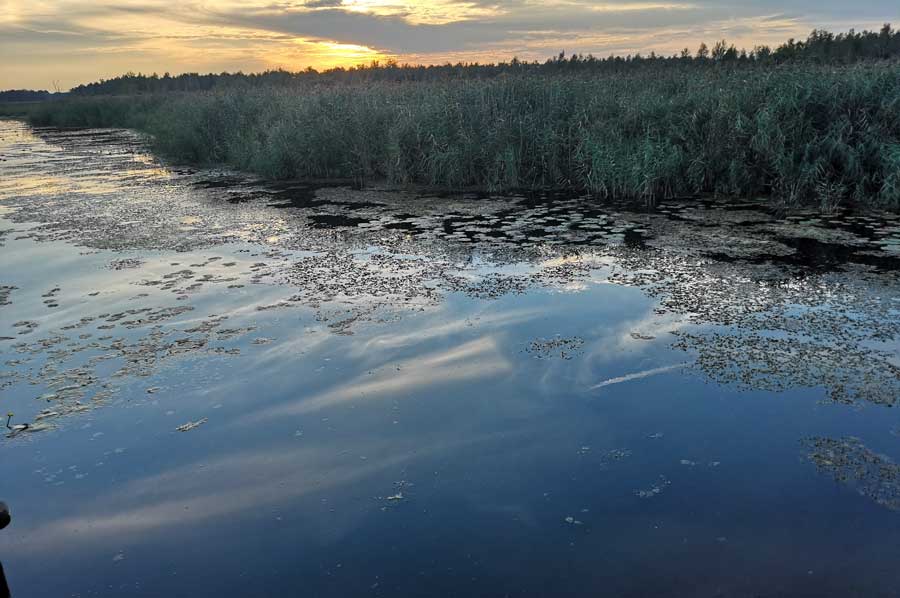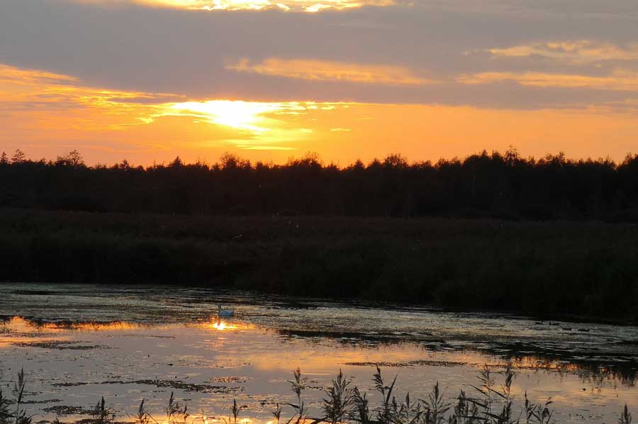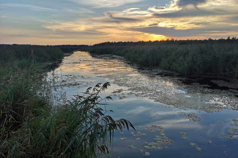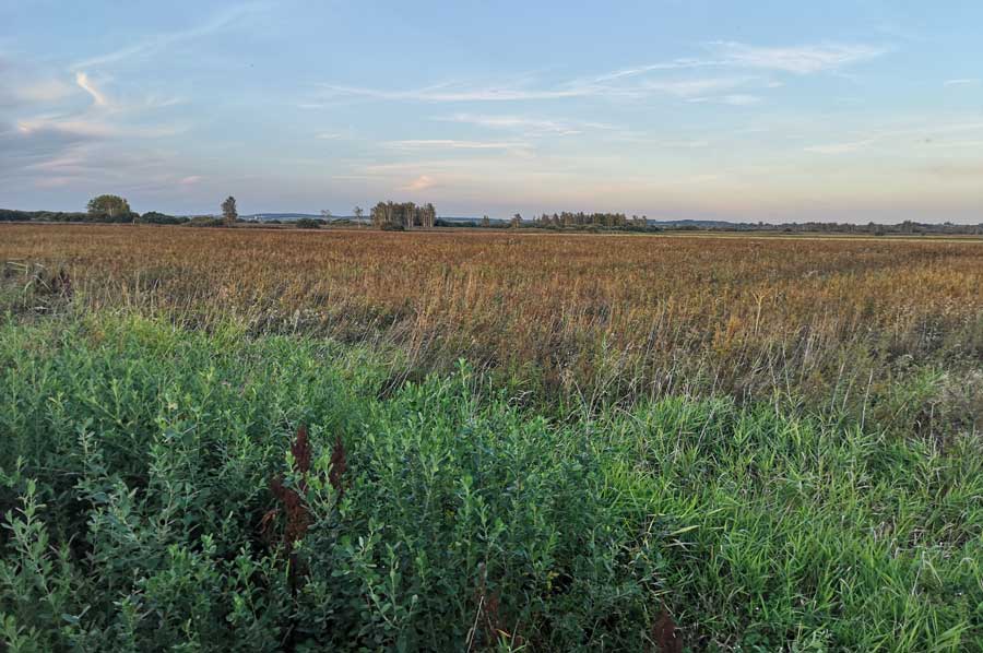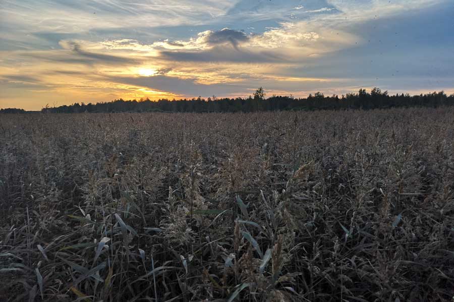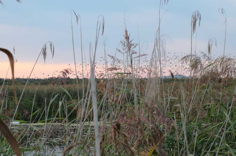 Wir sind fast am Ende des hölzernen Stegs angekommen, als ein erstes heftiges Rauschen fast wie eine kräftige Bö die Luft in Bewegung setzt: der erste Starenschwarm erreicht seine Schlafzone. Wenn die Abendsonne den Horizont berührt und Tausende Stare im Schilf einfallen, kann man erahnen, weshalb Massenvögel die Menschen schon immer beeindruckt haben, ja teilweise gar für Horrorszenarien herhalten mussten (Die Vögel / Alfred Hitchcock).