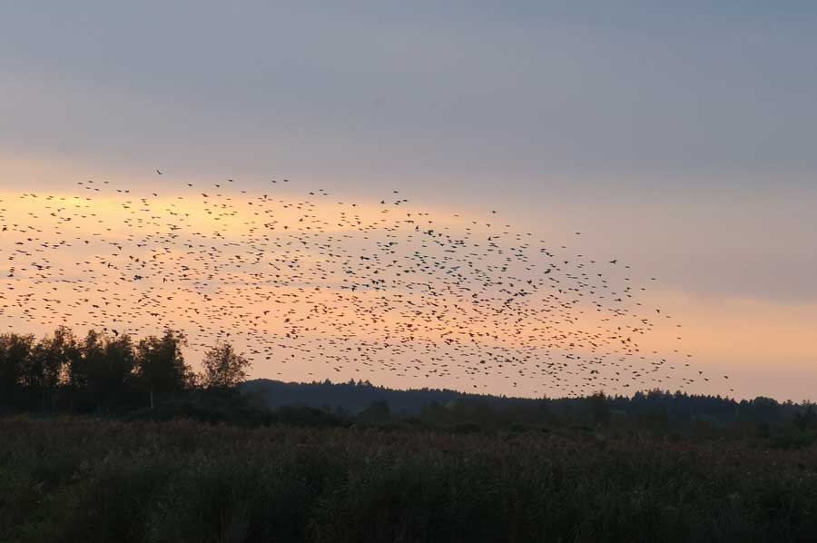 Massenschlafplätze wie hier am Federsee für die Stare sind mindestens ebenso spektakulär wie vogelkundliche Raritäten. Außer den hier bereits angesprochenen Staren, den Krähen, Dohlen, Elstern und Kolkraben lieben es auch Drosseln, Schwalben, Pieper und Bachstelzen gesellig zu schlafen, auch wenn es eine Weile dauert, bis sich alle Individuen hinsichtlich der Schlafplätze geeinigt haben. Gleiches gilt für Kormorane, Möwen, Kornweihen, Schwarz- und Rotmilane. Die Gemeinschaft gewährt Schutz vor Feinden, Informationen über ergiebige Nahrungsquellen und man kann einen Brutpartner kennen lernen.
