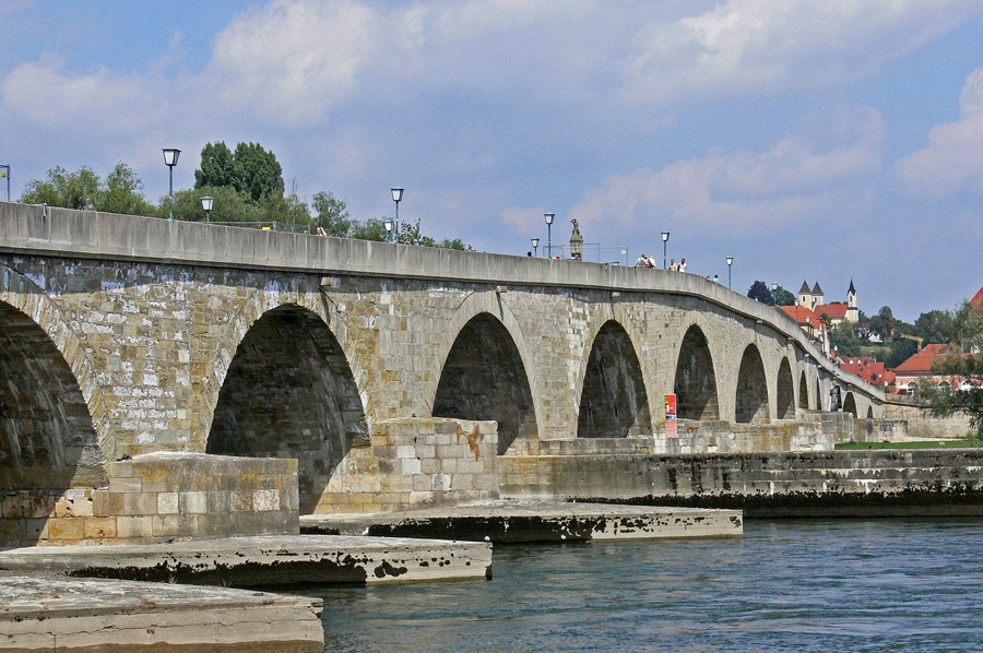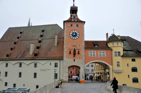Die Steinerne Brücke mit ihrem imposanten Brückturm wurde in den Jahren zwischen 1135 und 1146 erbaut. Sie gilt als Vorbild für die Karlsbrücke in Prag und gehört zu den bedeuteten Brückenbauwerken des Mittelalters. Kaiser Friedrich I. Barbarossa brach hier im Mai 1189 mit seiner großen Streitmacht zum 3. Kreuzzug auf. Der am südlichen Ende der Brücke befindliche Brückturm war in der Vergangenheit ein wichtiger Bestandteil der Regensburger Stadtbefestigung. Der Brückturm, der auch Schuldturm genannt wird, ist der letzte von ehemals drei Wehrtürmen an der Steinernen Brücke. In der Vergangenheit waren hier oftmals Schuldner eingesperrt, die im wahrsten Sinne des Wortes ihre Schulden "einholen" mussten – mittels eines angelähnlichen Stabs oder einer Schnur, die sie vom Turmfenster herabließen, um die eine oder andere Münze zu erbetteln. Der Wächter lebte in einer kleinen Türmerwohnung, die aus zwei kleinen Zimmern und einer Küche im oberen Stockwerk bestand. Der mittelalterliche Torturm entstammt dem 14. Jahrhundert, hier wurde der Zugang zur Altstadt und dem Dom kontrolliert.