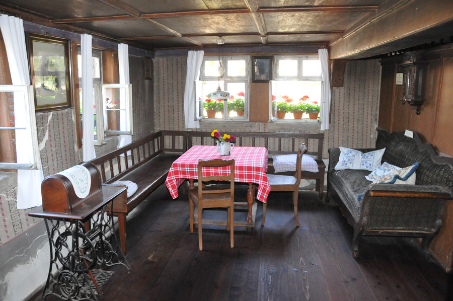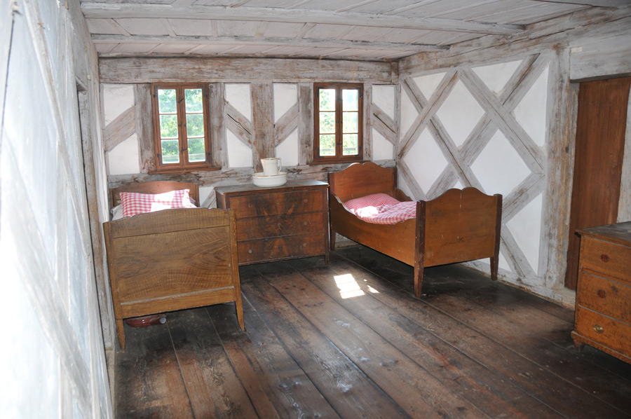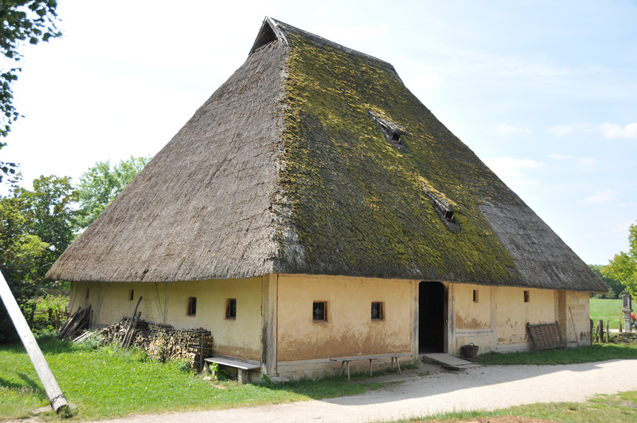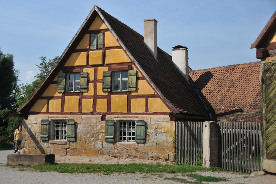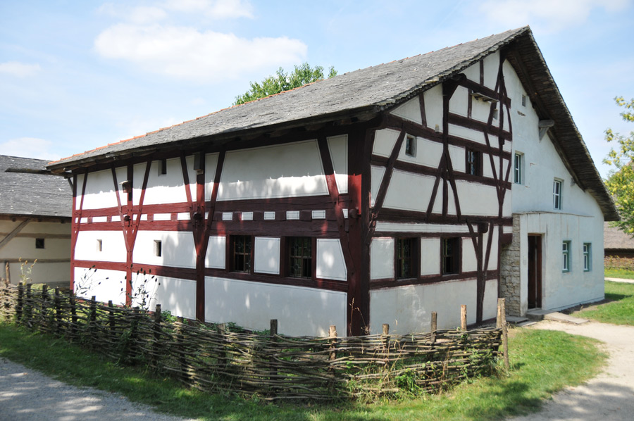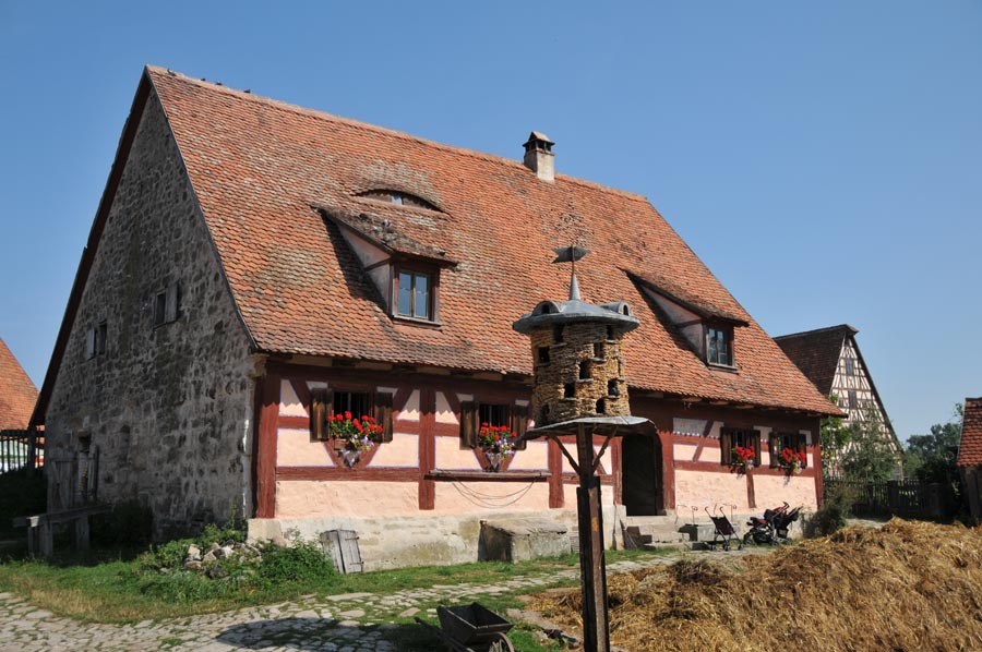 Wir setzen den Weg fort und kommen zur Baugruppe der historischen Gebäude aus dem Altmühlgebiet. Hier ist es die besondere Art der Dacheindeckung aus Kalkplatten, die so außergewöhnlich erscheint. Ein in der Gruppe der Jurahäuser befindliches Taglöhnerhaus entstammt dem 14. Jahrhundert. Allein die Konstruktion des Dachtragwerks ist bei dem Gewicht der Eindeckung schon bewundernswert.