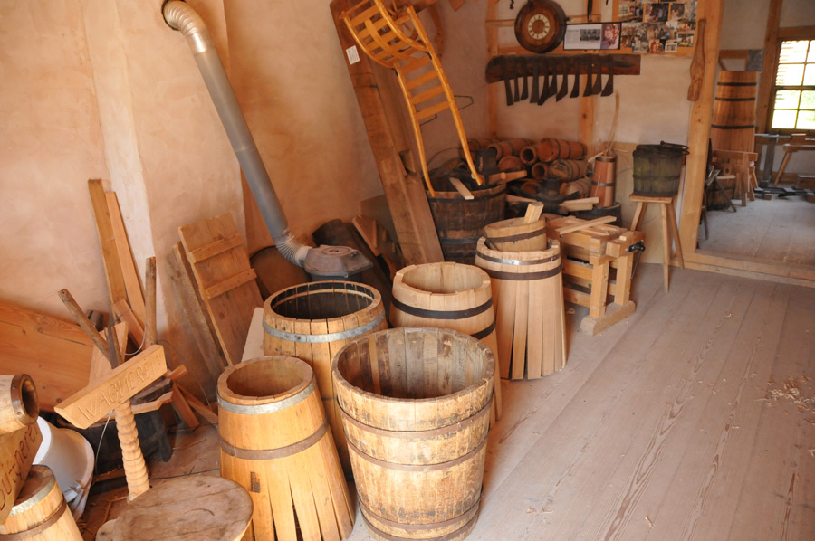 Interessant und lebendig sind auch die Schauvorführungen, bei denen Handwerker ihre Fähigkeiten zeigen. So stößt man auf Zimmerleute, Steinmetze und Büttner, die am Material zeigen, wie früher gearbeitet wurde. Glaser, Schreiner und Schmiede zeigen ihr Können, selbst ein Maler zeigt, wie vor Jahrhunderten kahle Wände mit Strukturrollen und Naturfarben die Räume verschönert und wohnlich gestaltet wurden. Auch hier überall Leben und Aktion. Klar werden all diese Aktivitäten zum Aufbau und der Pflege des Museumsdorfes sowieso benötigt. Aber es ist ein äußerst cleveres Konzept, dies auch all den Besuchern vorzustellen und mit einzubinden. Das auf dem Gelände dann auch Brot aus dem Steinofen und Honig, Marmelade aus Eigenproduktion angeboten wird, erscheint dann schon selbstverständlich.