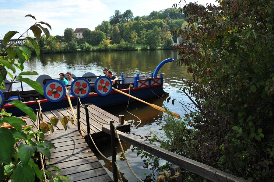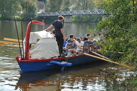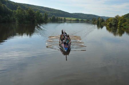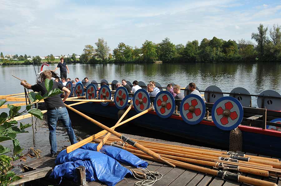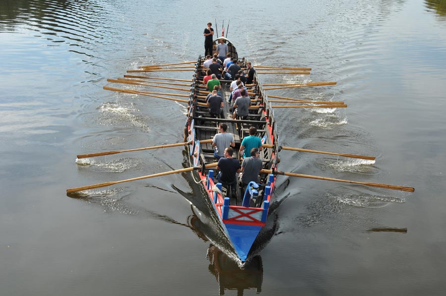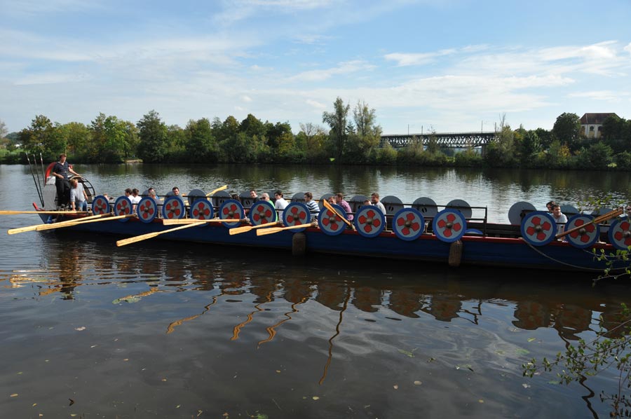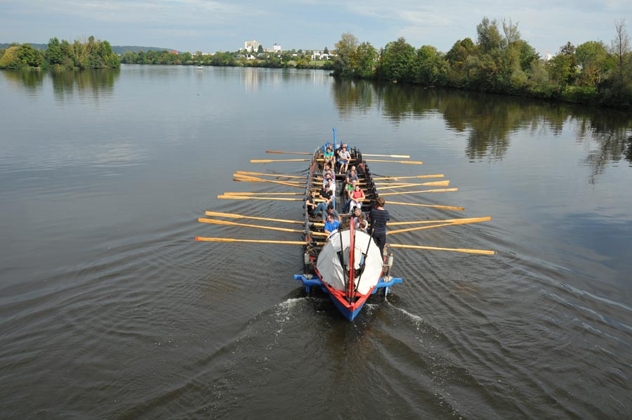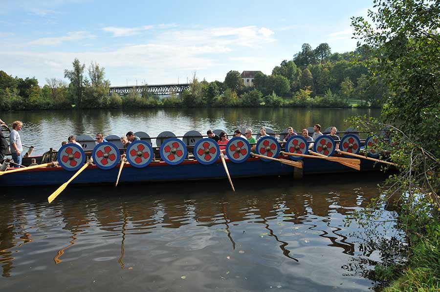 Es war aber ein reiner Zufall, das wir diesem Ruderboot, noch dazu gut besetzt und in voller Aktion, jetzt auf der Naab sehen sollten. Die Pseudo-Römer an Bord hatten auch, so konnten wir durchaus von oben beobachten, kräftig zu rudern, um das Schiff auf Kurs zu halten. Imposant entstand so ein sehr intensiver Eindruck, welche Strapazen römische Soldaten einst zu erdulden hatten und welche Disziplin gefordert war.