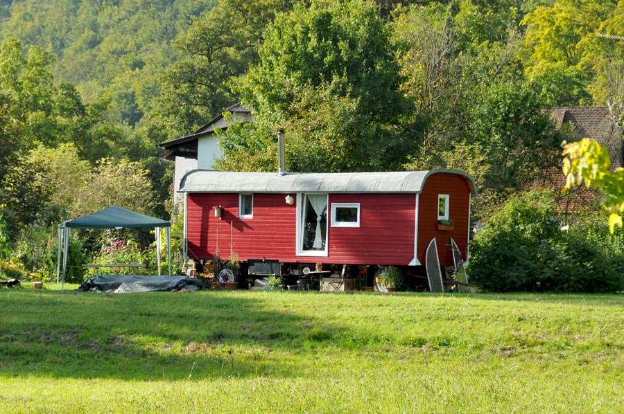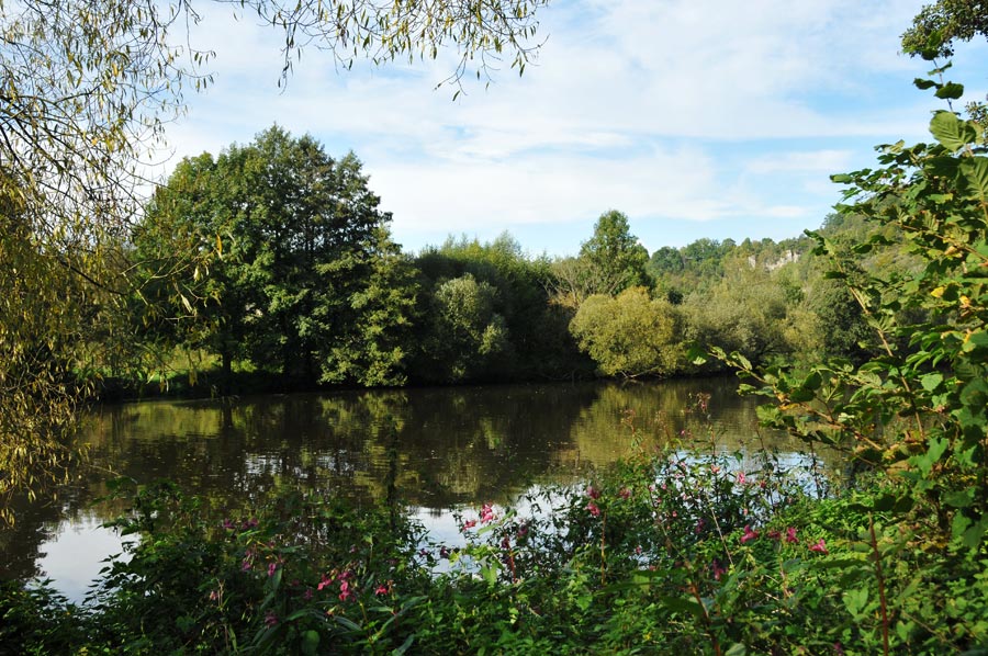 Der Naabradweg führt direkt hinter dem Campingplatz entlang, dann zunächst entlang ausgedehnter Maisfelder, später durch ufernahe Baumbestände, die die kleine Gartenlauben der Anrainer fast komplett verstecken. Neben etlichen idyllisch gelegenen, schmucken Wochenendhäusern treffen wir auf einige Campingwagen, die auf privaten Grundstücken der Naherholung dienen, aber auch auf einen ehemaligen Bauwagen, der am Rande einer Wiese mit großem Panoramafenster versehen auch ein wunderschönes Wochenendidyll darstellt. Immer wieder treffen wir auch auf Kanufahrer, die den Flusslauf bei noch sommerlichen Temperaturen für einen Ausflug nutzen. Der Radweg wird, so zumindest unser Eindruck, doch sehr ausgiebig genutzt, neben Fahrradwanderern treffen wir auf Mountainbiker und auf wirklich schnelle Rennradfahrer, eine bunte Mischung outdoor-begeisterter Menschen.