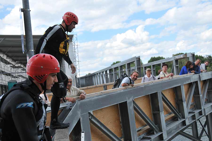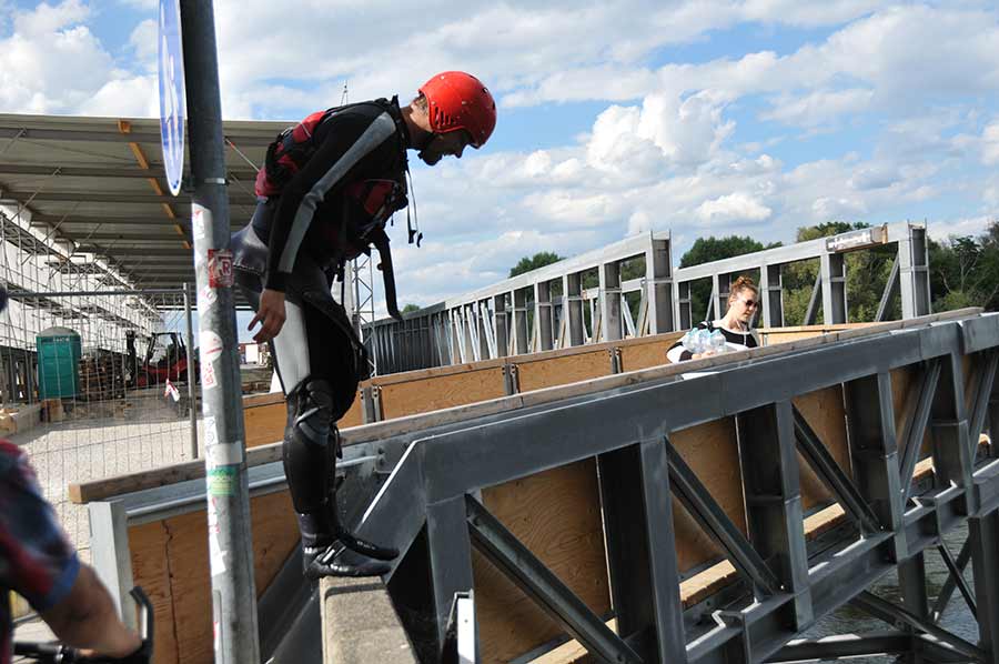 Auf unsere Frage nach dem warum, gab es nur ein kurzes Achselzucken und schon war der Springer in den Wogen der Donau entschwunden. Uns interessierte auch das äußerst wendig aussehende Kanu, dass wohl eine Mischung aus Kanadier und Kajak zu sein schien, eher etwas untypisch als es auf den ersten Blick einer Kanuklasse zuordnen zu können.