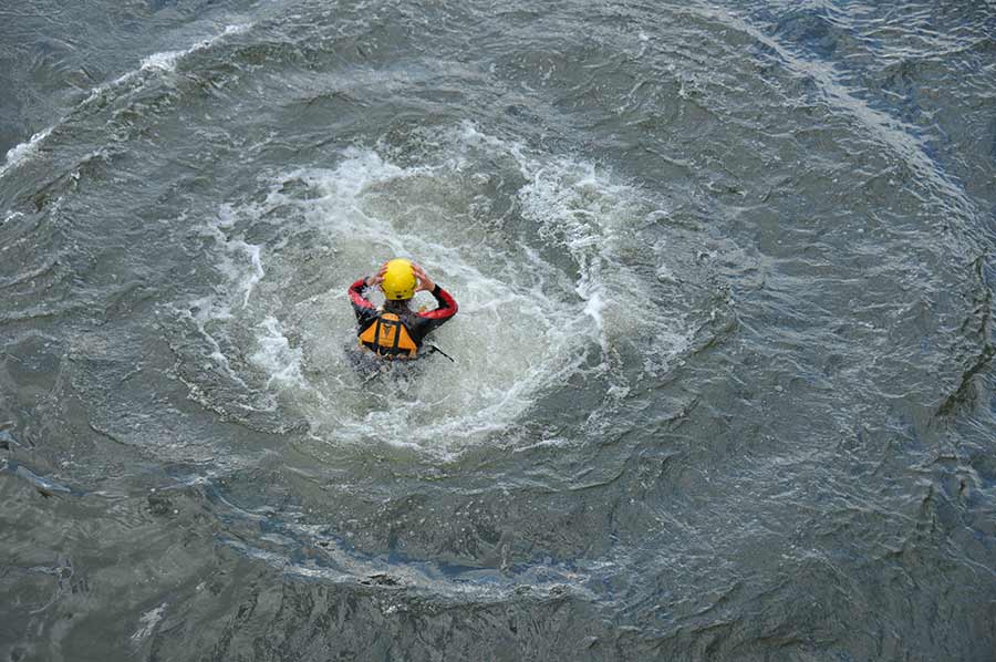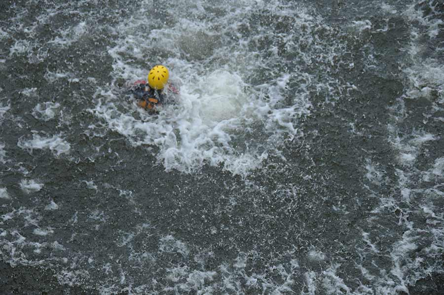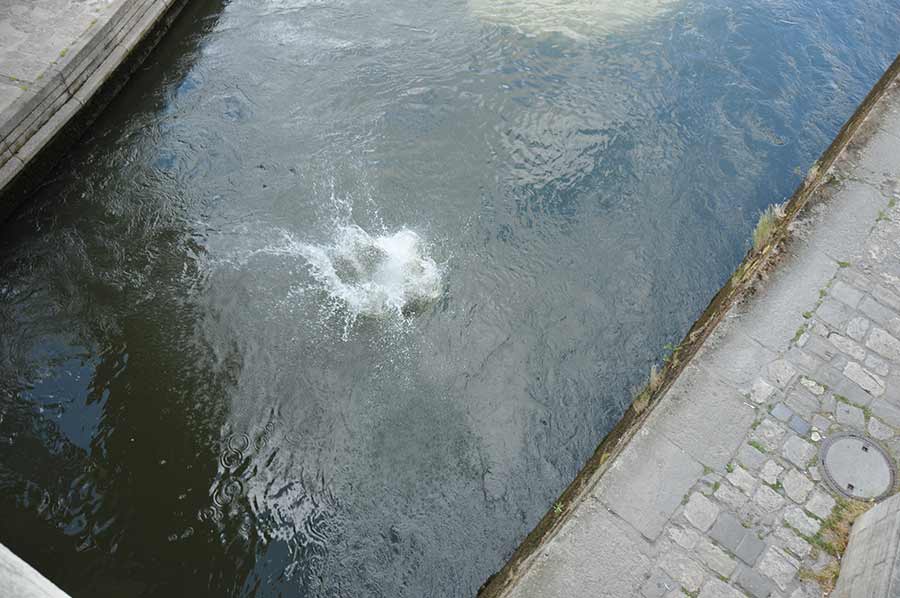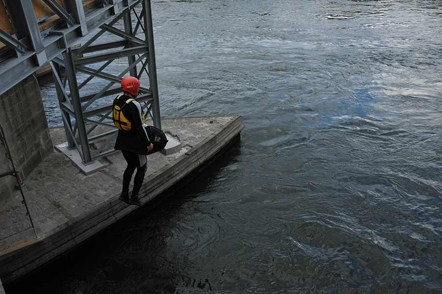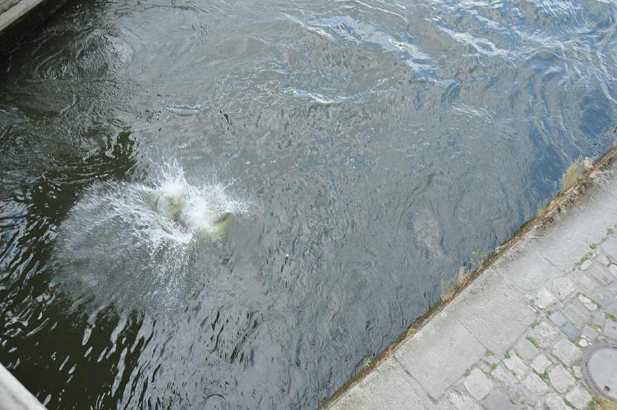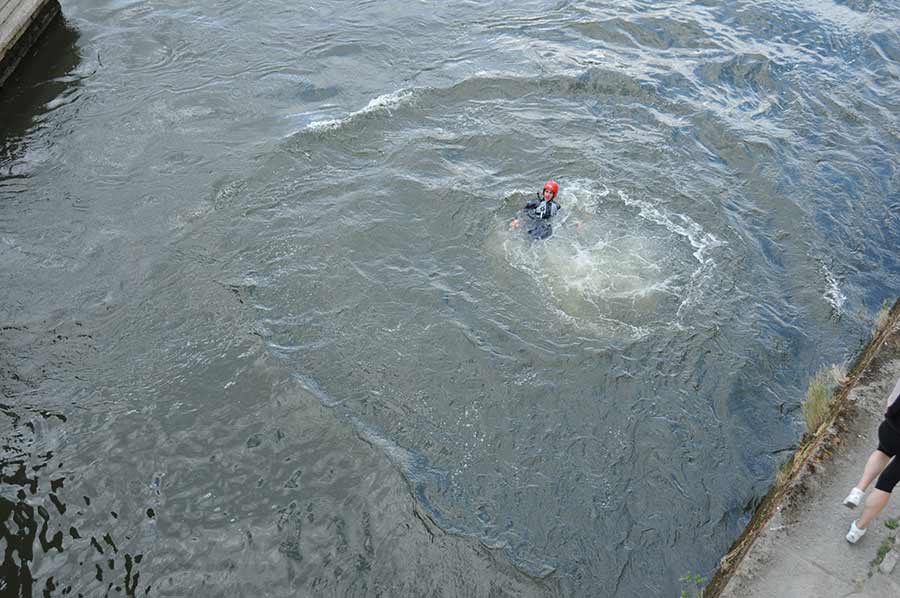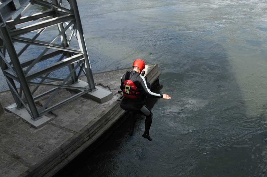 Aber nun noch kurz zurück zu den Brückenspringern, die mittlerweile alle ihre Kanus unterhalb der Steinernen Brücke abgelegt hatten und zwecks Sprung vom Geländer der Steinernen Brücke sich auf derselben versammelt hatten. Neben dem Neoprenanzug trugen alle Schutzhelme, was auf den eher sportlichen Umgang mit ihren Booten hinwies. Auch Schwimmwesten waren bei allen Springern vorhanden, eine zumindest professionell und an Sicherheitsaspekte denkende, gut ausgestattete Gruppe, so unser Eindruck, die auch das Springen ähnlich abhandeln würden. Und so wartete dann jeder Springer auch auf das Wiederauftauchen des Vorspringers, bevor er sich in die Fluten begab.