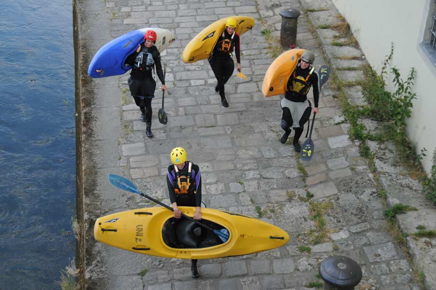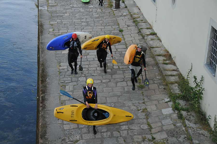 Als ob sie nicht schon nass genug waren, die Gruppe der Kanufahrer von der Donau, die wir beim Anlegen direkt an der wohl bekanntesten Würstchenbude Regensburgs beobachten konnten.