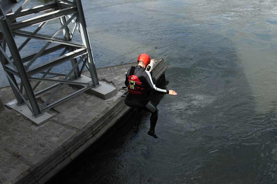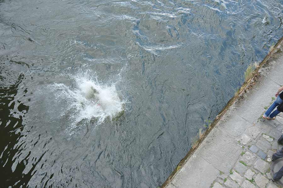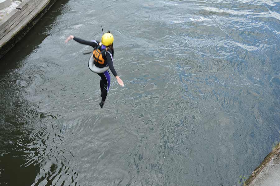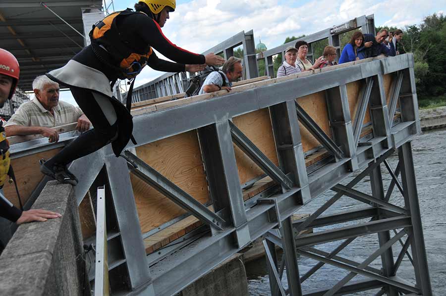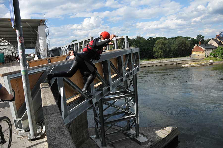Nach bestimmt herrlicher Fahrt auf der Donau gab es zum Abschluss einen doch Mut erfordernden Sprung von der Steinernen Brücke, der sofort unzählige Zuschauer anlockte.