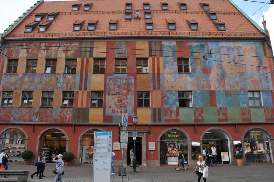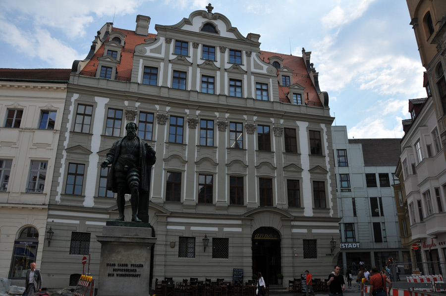 Wir durchqueren die Fußgängerzone, die allerdings im Moment eher einer Großbaustelle gleicht, in Richtung Sozialsiedlung Fugger. Das schwäbische Kaufmannsgeschlecht Fugger war bereits im 14. Jahrhundert eine Großunternehmung, die sich im weitesten Sinne mit dem Handel beschäftigte und damit sehr wohlhabend wurde. Als im Jahr 1367 Hans Fugger in die damals freie Reichsstadt Augsburg übersiedelte, begann der Aufstieg der Familie vom reinen Weber zum Händler von Baumwolle aus Italien.