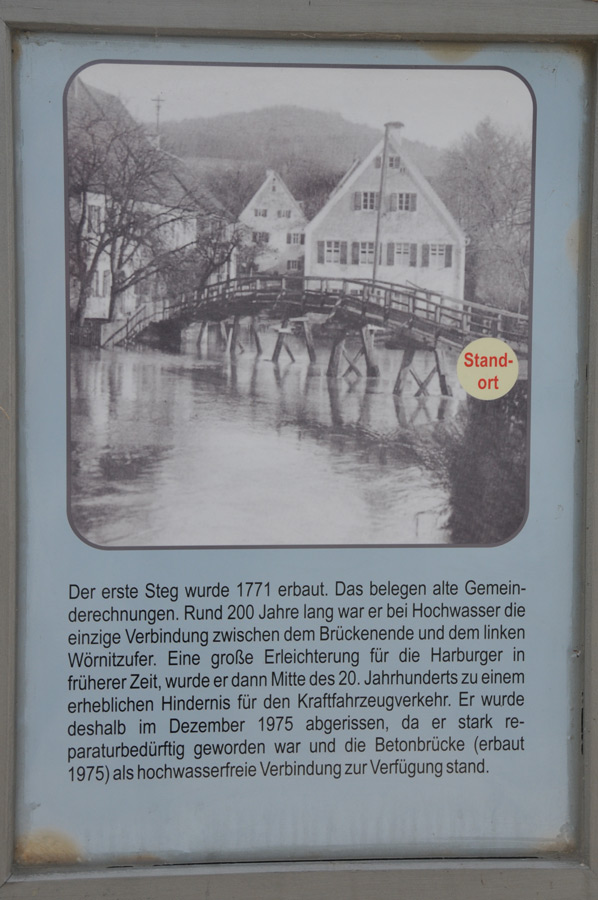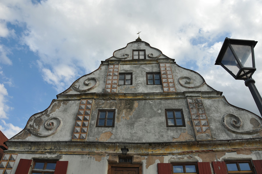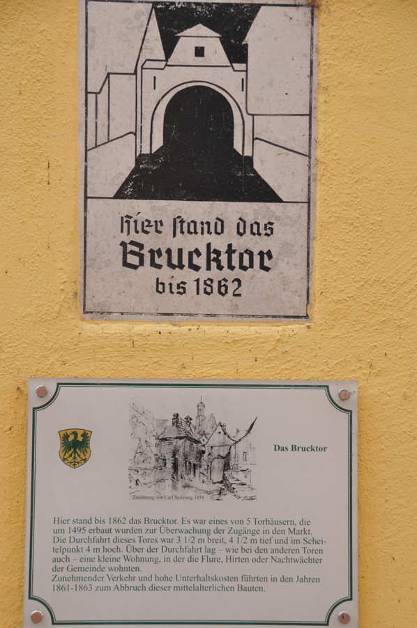 Wir überqueren die steinerne Brücke, die als Einbahnstraße auch von Kraftfahrzeugen noch genutzt wird, können weitere Fotos der herrlichen Flussauen machen und gelangen an die ersten Häuser, die mit der Brücke verwachsen erscheinen. Einst hatte Harburg fünf hölzerne Stadttore, die zum Schutz der Bürger allabendlich geschlossen wurden. Hier an der steinernen Brücke stand einst das Brucktor, das leider wie alle anderen Tore auch, zwischen 1861 und 1863 abgerissen wurden. Hieß es zunächst und offiziell, die Tore seien baufällig und zu teuer im Unterhalt oder gar ein gesundheitliches Risiko für die Bewohner, stellte sich später als wahrer Grund heraus, das den Bürgern die Tore schlichtweg nicht mehr gefielen. Die anderen Tore waren das Egelseetor, das sich zum Egelsee hin öffnete, das Nördlinger Tor, das auch Tiefes Tor genannt wurde, das Vesttor, das zur Festung hinauf führte sowie das Griestor bzw. das Donauwörther Tor. Da die Stadt durch die eng miteinander verbundenen Häuser fast komplett geschlossen erschien, war der Bau einer Stadtmauer nicht notwendig.