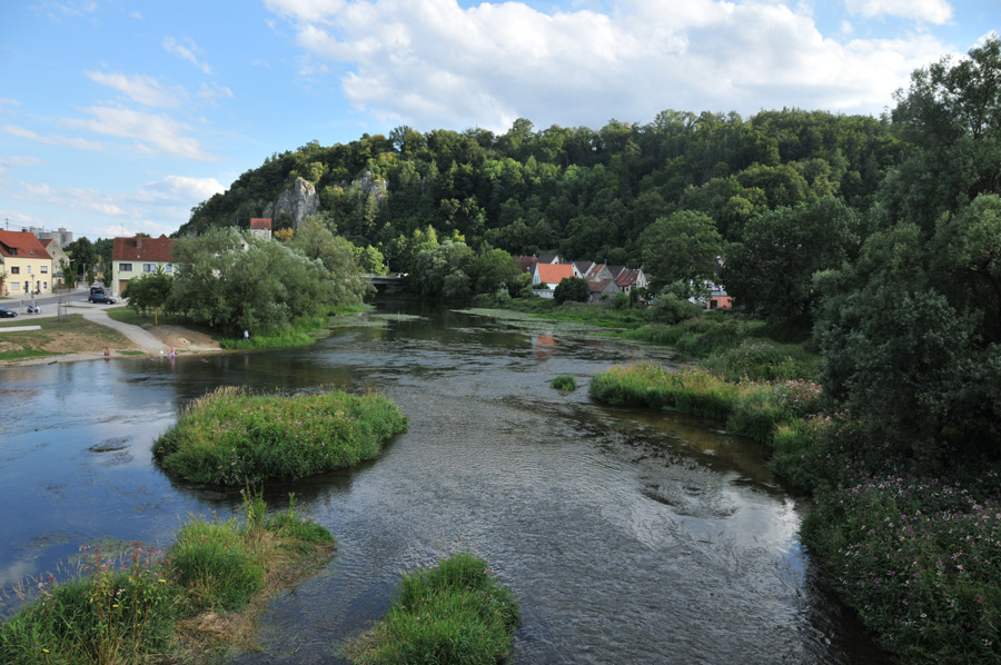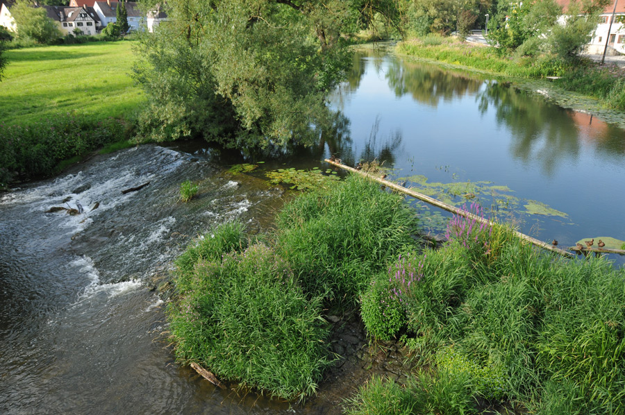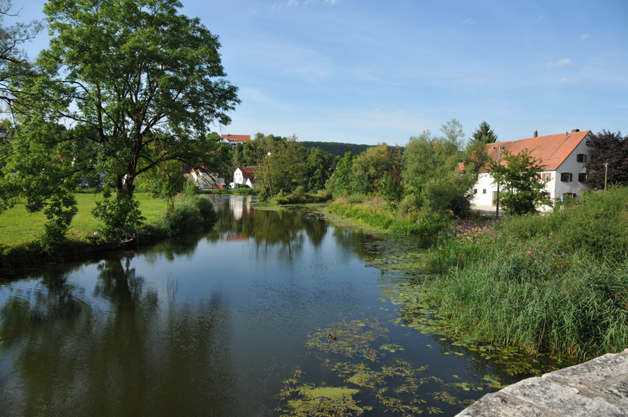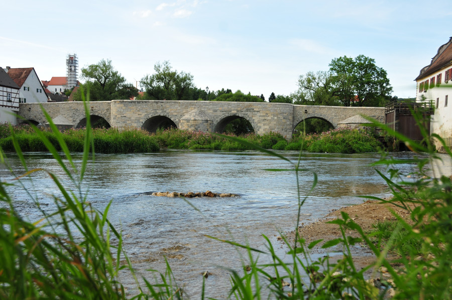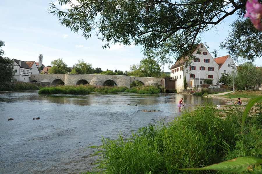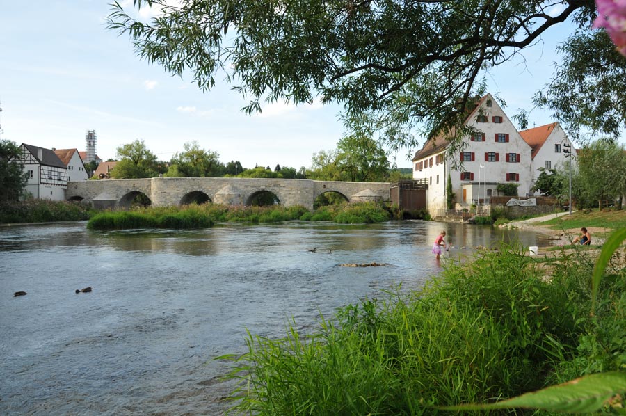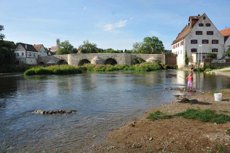 Nach der teilweise sehr engen Ortsdurchfahrt überquerrten wir die Wörnitz und folgten der Straße am gegenüberliegenden Ufer zurück bis zur alten Steinbrücke, die natürlich unser besonderes Interesse geweckt hatte. Gut ausgebaute Parkplätze direkt am hier flach abfallenden Ufer luden auch uns zum Verweilen ein. Erste Bilder direkt vom Flussufer, das auch von spielenden Kindern zum Fischen genutzt wurde, zeigen die ganze Idylle des Ortes.