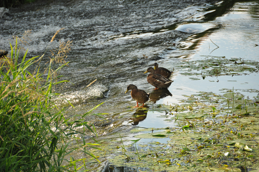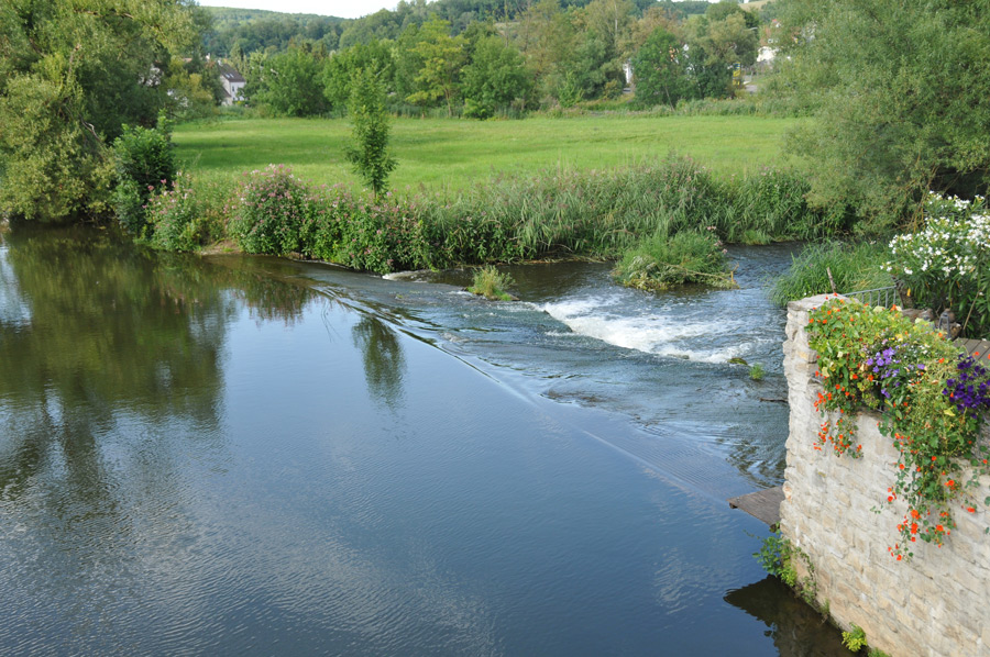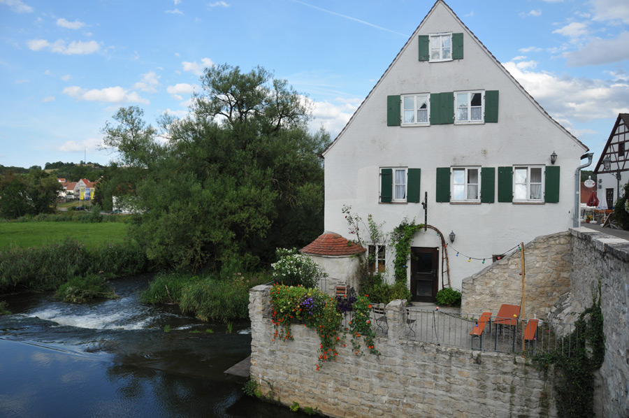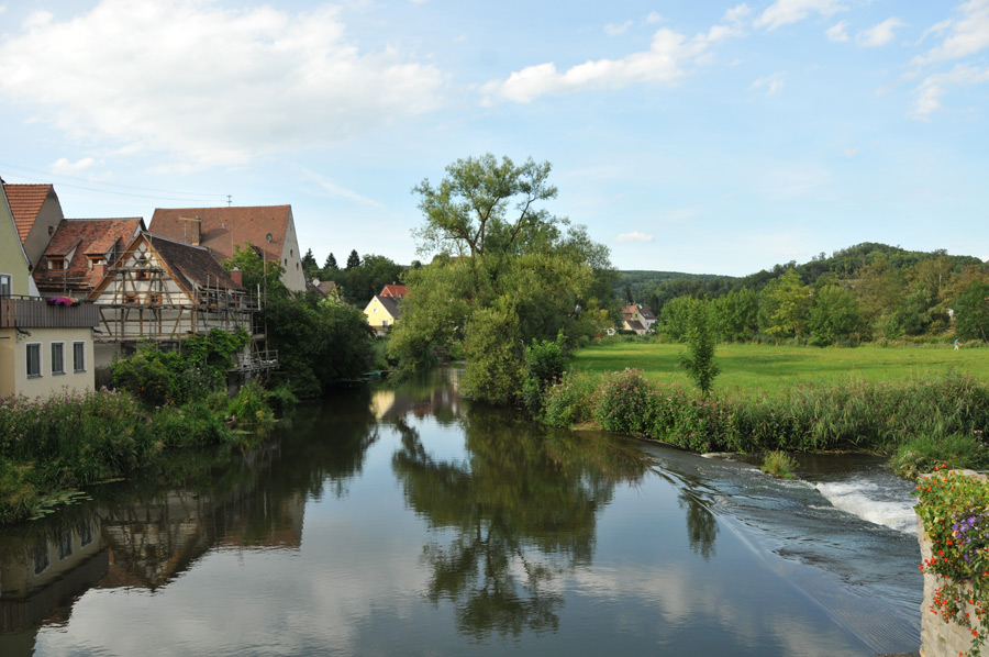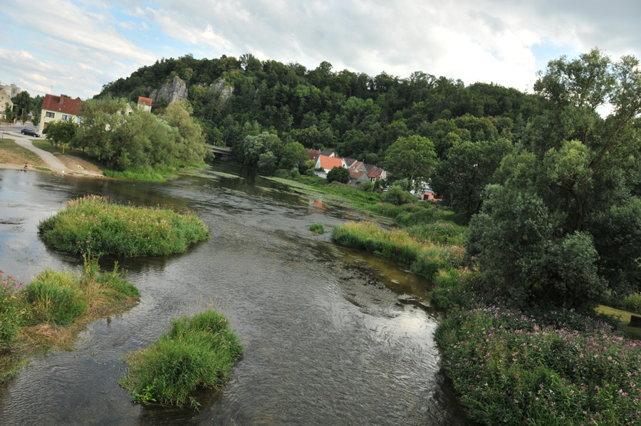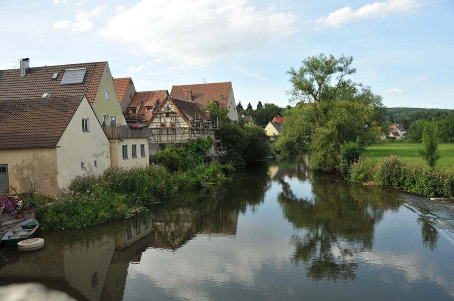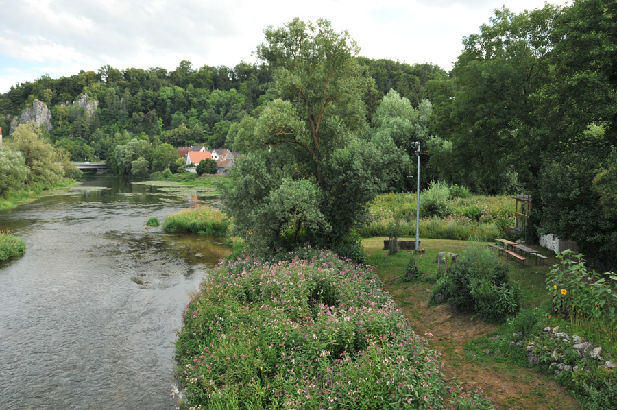 Nach der teilweise sehr engen Ortsdurchfahrt überquerrten wir die Wörnitz und folgten der Straße am gegenüberliegenden Ufer zurück bis zur alten Steinbrücke, die natürlich unser besonderes Interesse geweckt hatte. Gut ausgebaute Parkplätze direkt am hier flach abfallenden Ufer luden auch uns zum Verweilen ein. Erste Bilder direkt vom Flussufer, das auch von spielenden Kindern zum Fischen genutzt wurde, zeigen die ganze Idylle des Ortes.