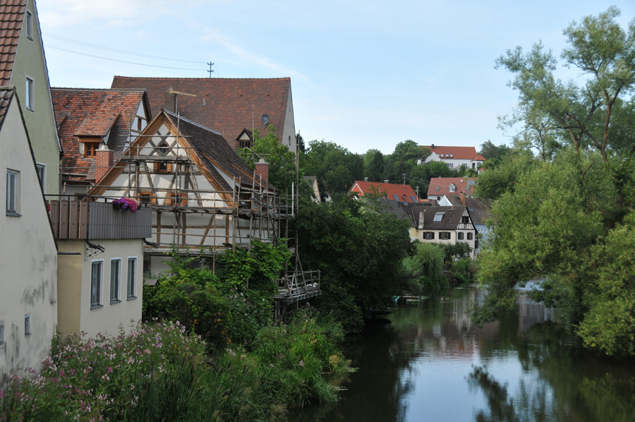 Allein die Brückenanlage und die damit verbundenen Häuser allein sind allemal den Besuch Harburgs wert. Ein wunderbarer Blick auf den Fluss, die dahinter befindlichen mittelalterlichen Häuser in den enge Gassen und die über allem thronende Burg liefern Fotomotive ohne Ende bei ständig wechselnder Szenerie allein durch die Bewegung des Wassers der Wörnitz. Leider für diesen Besuch zu spät entdeckten wir auch den Kanuverleih unmittelbar neben der steinernen Brücke. Wie herrlich muss eine Kanutour auf der Wörnitz sein. Weiter im Stadtzentrum treffen wir auf einige Radwanderer, die entlang der Wörnitz geradelt waren und nun für die Nacht in Harburg bleiben wollen. Ein exzellentes Radwandernetz macht ausgedehnte Touren leicht plan- und ausführbar. Auch für uns ist spätestens zum nächsten Frühjahr die Mitnahme von Rädern während unserer Besuchstouren fest mit eingeplant.
