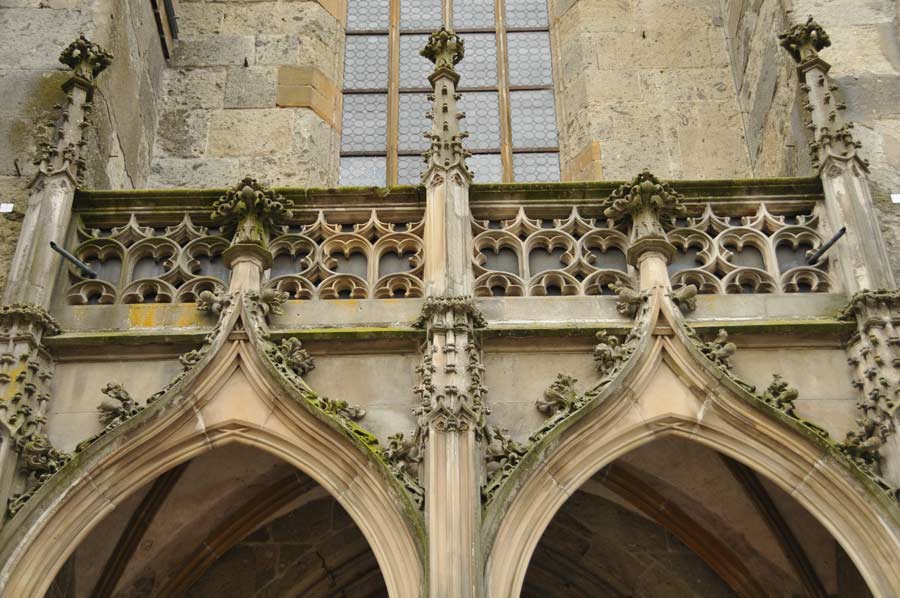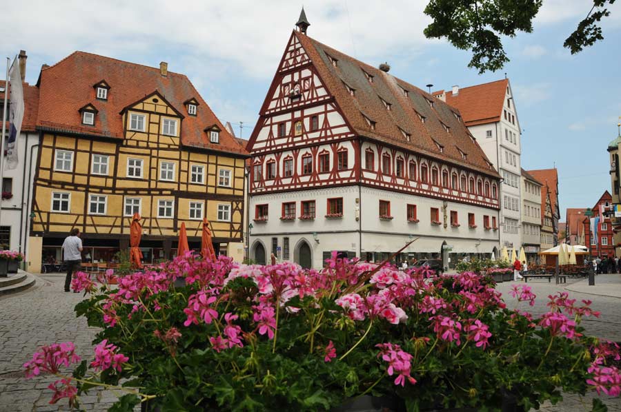 Uns war bereits vom Turm aus der historische Marktplatz aufgefallen, den wir nun als nächstes aufsuchten. Da gerade eine Gruppe von Touristen hier einige Erläuterungen durch den anwesenden Stadtführer erhielt, schlossen wir uns kurz der Zuhörergruppe an und erfuhren so einwenig von der Geschichte des Marktwesens in Nördlingen, der einmal im Jahr für etwa 10 Tage eher als Messe zu bezeichnen war. Tuchhändler präsentierten hier in dem 1442 – 1444 entstandenen Brot- und Tanzhaus ihre Waren während im Obergeschoss gefeiert wurde. Eine Brücke verband das Gebäude mit dem 1363 erbauten Fachwerkhaus Metzig, das normalerweise den Metzgern als Verkaufsraum diente, zu Zeiten der Messe allerdings der Erweiterung der Verkaufsfläche der Tuchhändler diente. Gegenüber liegt das Gasthaus zur Sonne, das um 1350 als Unterkunft für „hohe“ Gäste erbaut wurde. Neben Kaiser Friedrich III und Maximilian I um 1500 herum logierte hier im Jahr 1548 Karl V. Auch Johann Wolfgang von Goethe war im Jahr 1788 Gast des „Gasthauses zur Sonne“.