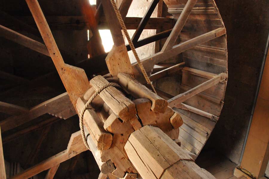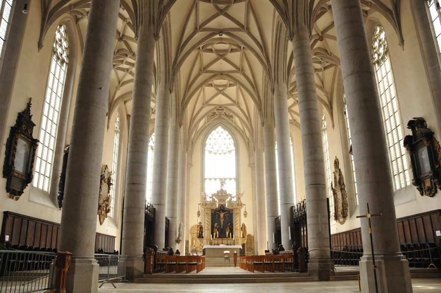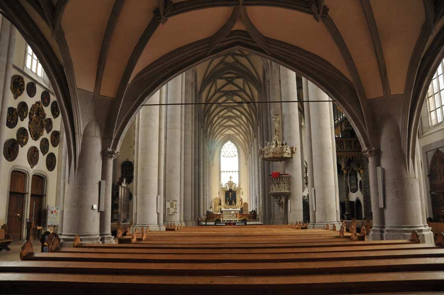 Wir verließen dann den Wehrgang der Stadtmauer, denn der 90 Meter hohe Kirchturm der in den Jahren 1427 bis 1505 erbauten gotischen St. Georgs-Kirche lockte dann doch zu sehr. Der von den Einwohner liebevoll „Daniel“ genannte Kirchturm kann über abenteuerliche Stein- und Holztreppen bestiegen werden und eröffnet dem Besucher einen herrlichen Ausblick über die Stadt und vor allem das gesamte Ries so das jetzt der Kraterrand des Meteoriteneinschlags klar am Horizont zu erkennen ist. Etwa 90 Meter hoch und 360° Rundumblick erlaubten sogar den Blick in die Kinderstube eines Storchenpaares, das auf dem Dach eines Stadthauses gebrütet hatte. Die Kirche selbst stand unter Restaurationsarbeiten, so das die Besichtigung sehr kurz ausfiel.