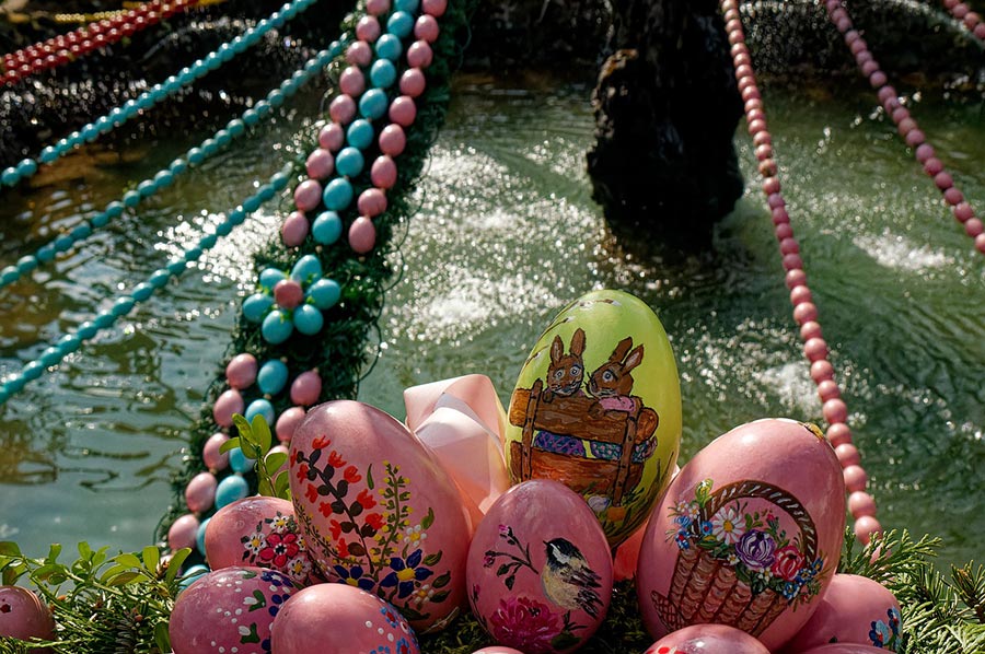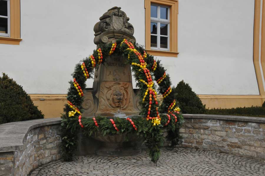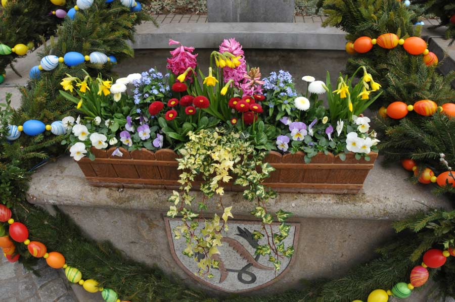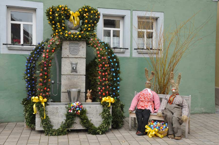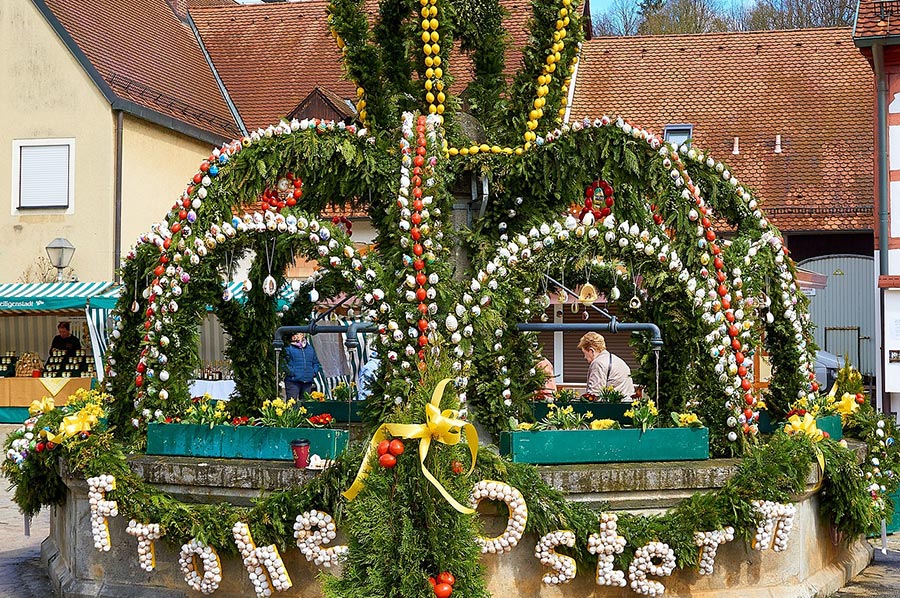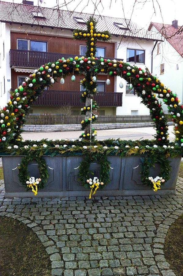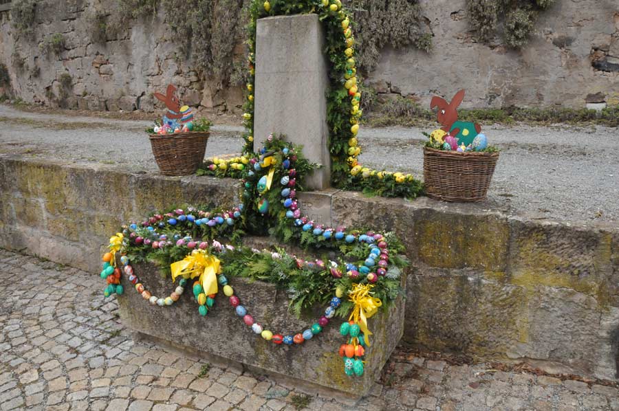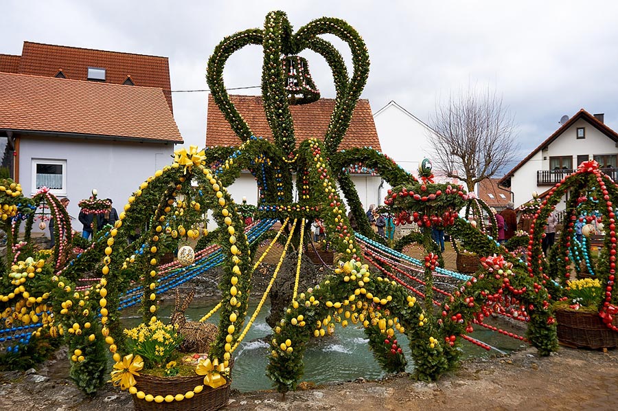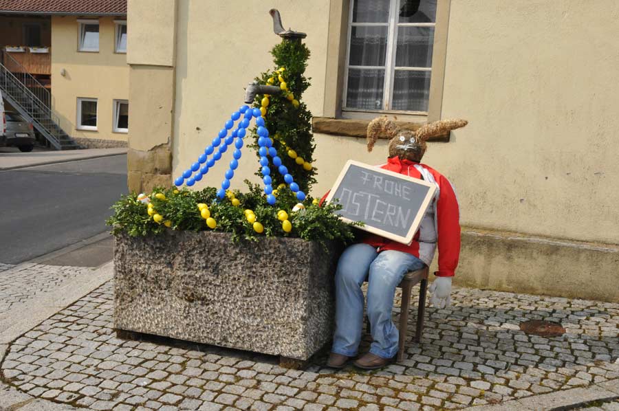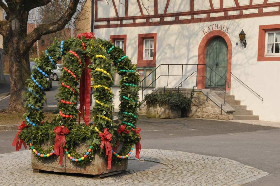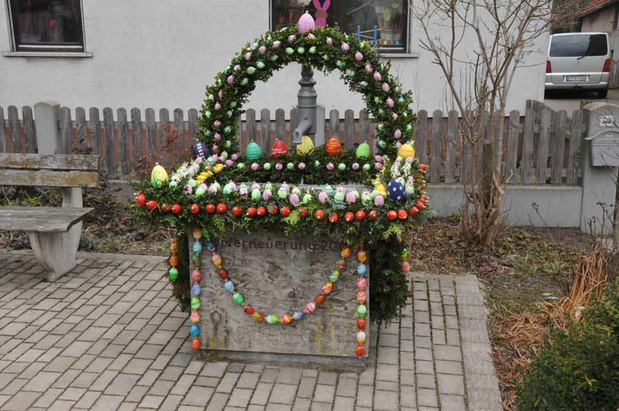 Der Brauch, die öffentlichen Brunnen in den Dörfern und Städten zur Osterzeit zu schmücken, soll ursprünglich aus der Fränkischen Schweiz stammen. Mittlerweile hat sich dieser Brauch über große Teile Frankens ausgebreitet. Mit Girlanden aus Tannengrün, die oftmals zu Kronen gebunden und mit vielen bunten Ostereiern verziert sind, werden kurz vor oder noch während des Karfreitags die Dorfbrunnen geschmückt. In der Mehrzahl aus ausgepusteten echten Eiern bestehend, die dann von Hand bemalt wurden, bietet dieser Brunnenschmuck ein herrliches Farbspiel in der ansonsten noch eher grauen Umgebung des sich langsam zurückziehenden Winters.