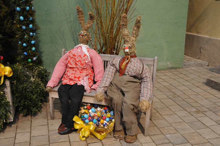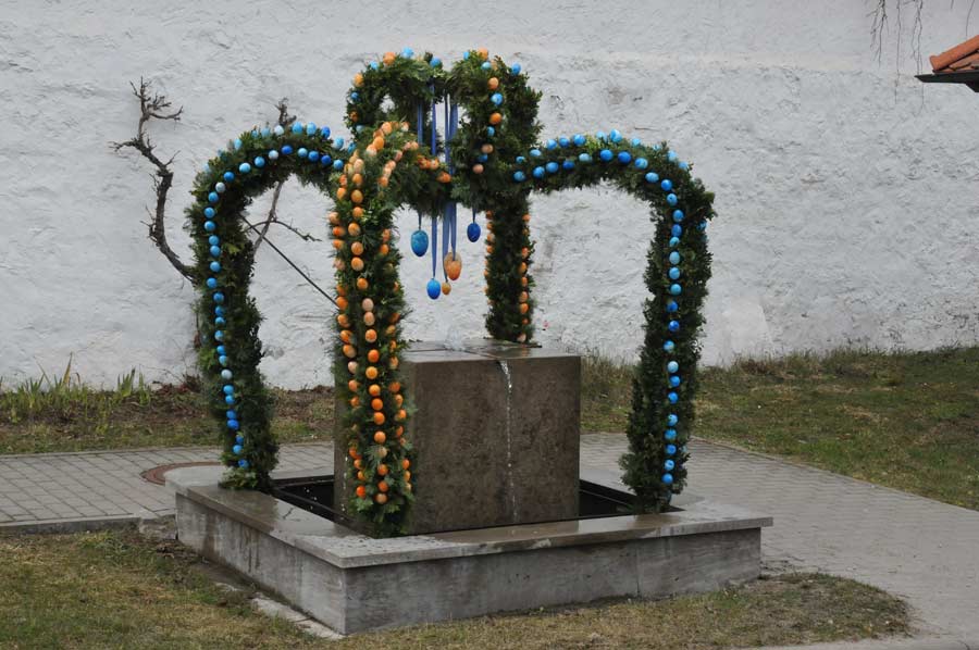 Wir nutzen den Vormittag des nun folgenden Karfreitags für eine kleine Rundfahrt durch Franken um uns einige dieser Brunnen in den dörflichen Gemeinden anzuschauen. Und tatsächlich gab es eine große Bandbreite unterschiedlichster Osterbrunnen, die uns an der Fahrtstrecke über Kaltensondheim, Feuerbach, Füttersee, Ebersbrunn, Biebelried, Kleinlangheim, Schlüsselfeld, Prühl, Westheim und Wiesentheid begegneten. Teilweise waren nicht nur die Brunnen mit Tannengrün und Ostereiern geschmückt sondern auch weitere Osterfiguren dem Ensemble hinzugefügt, so dass sich ein buntes Osterbild ergab.