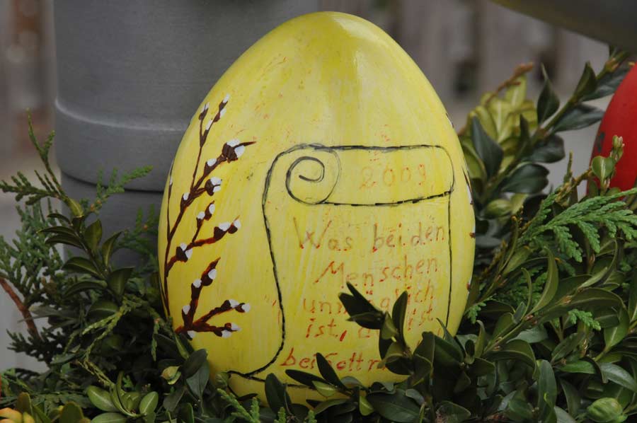 Wir waren gerade dabei, einige Fotos am Osterbrunnen von Kleinlangheim zu machen, als uns eine Passantin ansprach und auf einige Details des auch von ihr mit gestalteten Brunnens hinwies. Sie konnte uns auf einige der ausgeblasenen und dann handbemalten Hühnereier hinweisen, die schon vor Jahren von ihrer Nichte während der Kindergartenzeit gefertigt wurden. Jedes Jahr werden diese Eierschalen sorgfältig verpackt und aufgehoben, so dass sie im kommenden Jahr erneut ausgestellt werden können. Natürlich kommen auch jedes Jahr neue Motive hinzu, die in den örtlichen Schulen oder Kindergärten zur Osterzeit gefertigt werden. Ein schöner Brauch, der ein wenig mehr Farbe und Licht in die noch trübe Alltagsstimmung bringt.