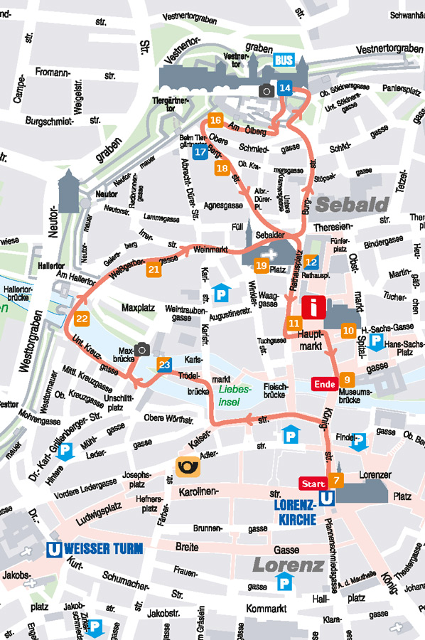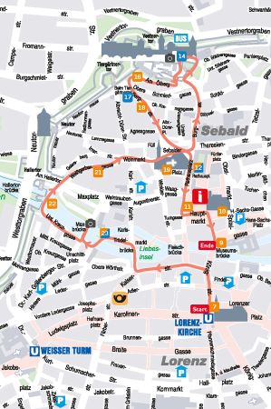 Diese gilt, neben der Kettenbrücke in Budapest, als älteste erhaltene eiserne Kettenbrücke in Kontinentaleuropa und führt direkt zur Weißgerbergasse (Nr 21), deren rund zwanzig historischen Häuser meist aus Fachwerk bestehen. Vorbei an der Sebalduskirche (Nr. 19), der ältesten Pfarrkirche Nürnbergs, führt nun der Weg zum Alten Rathaus (Nr. 12) mit den Mittelalterlichen Lochgefängnissen (Nr. 12). Nun geht es bergauf, zum Wahrzeichen der Stadt: der Kaiserburg (Nr. 14). Der Weg lohnt sich nicht nur wegen der Ausstellung "Kaiser - Reich - Stadt" oder des Kaiserburg-Museums, sondern vor allem auch wegen dem fantastischen Ausblick über die Altstadt. Vorbei am Sinwellturm gelangen wir entlang des Ölbergs zum Albrecht-Dürer-Haus (Nr.17), der ehemaligen Wohn- und Arbeitsstätte des berühmten Künstlers.