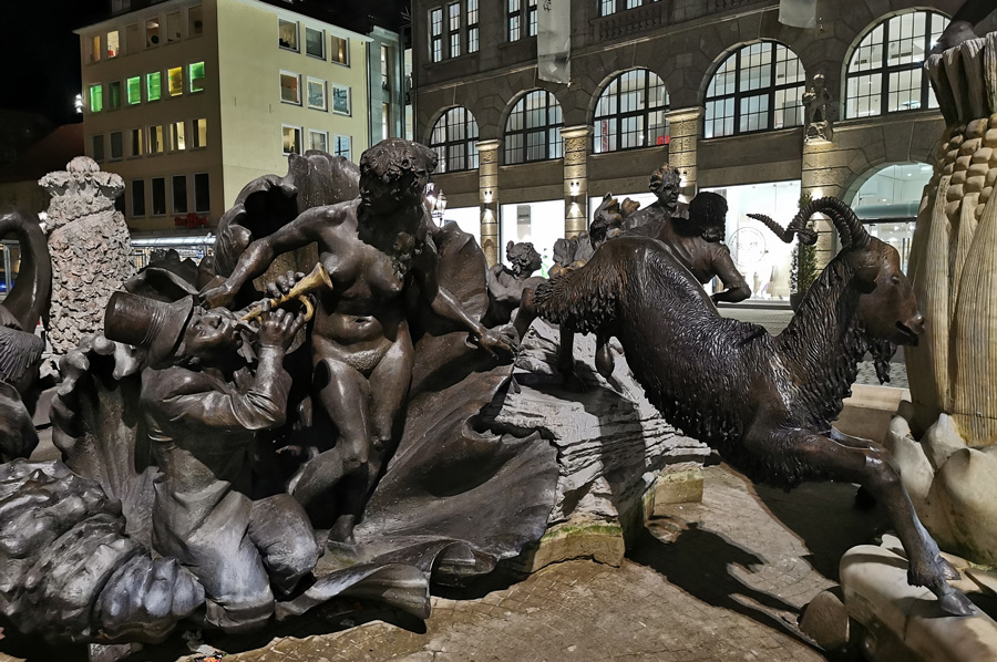 Hier, am Tiergärtnertorplatz (Nr. 16), empfiehlt es sich, den Abend ausklingen zu lassen und "sich unters Volk zu mischen". Im Sommer ist dies ein besonders beliebter Hotspot unter den Nürnbergern, jetzt Mitte März war es aber noch zu kalt. Bergab führt Sie Bergstraße (Ein weiterer Tipp: Besuchen Sie die Historischen Felsengänge (Nr. 18) und probieren Sie ein Nürnberger Rotbier) zum Hauptmarkt mit dem Schönen Brunnen (Nr. 11). Drehen Sie unbedingt am Goldenen Ring und wünschen sich dabei etwas!