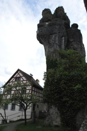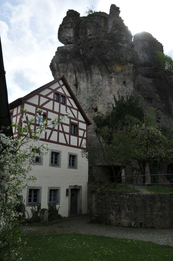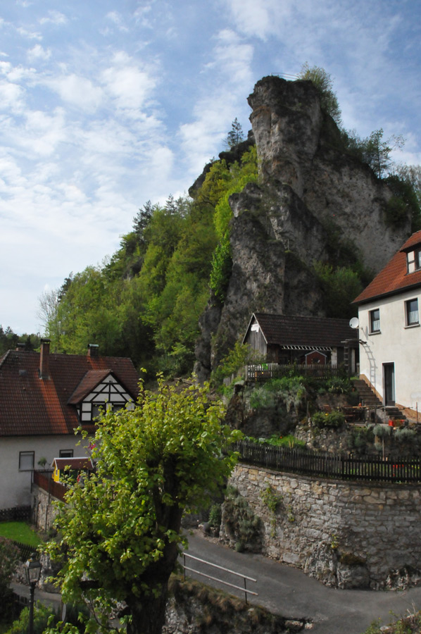 Der Judenhof in Tüchersfeld mit seinem mächtigen Felsblock im Hintergrund gilt als Wahrzeichen der Region.