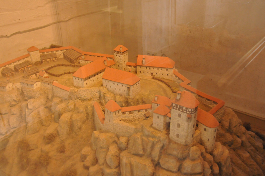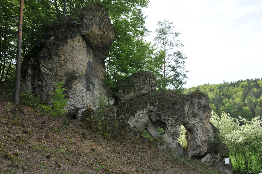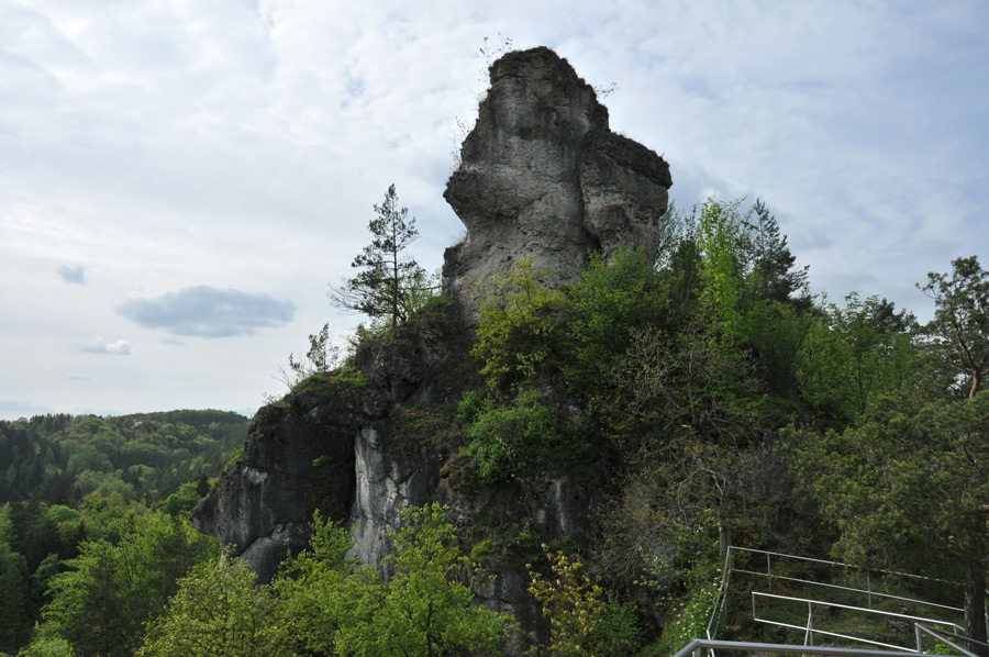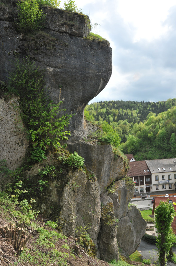Wir erfahren hier auch etwas zur Entstehungsgeschichte dieser markanten Felsen, die den Ort Tüchersfeld und die ganze Region Fränkische Schweiz so einzigartig machen. Einstmals ein riesiges Meer, entstand durch die Hebung der Frankenalb im Jungtertiär und der darauffolgenden Sand- und Gesteinserosion über die Jahrtausende hin die eindrucksvolle Landschaft mit tief eingeschnittenen Flusstälern, riesigen Felsstürzen und Höhlen, die heute touristisch genutzt werden.