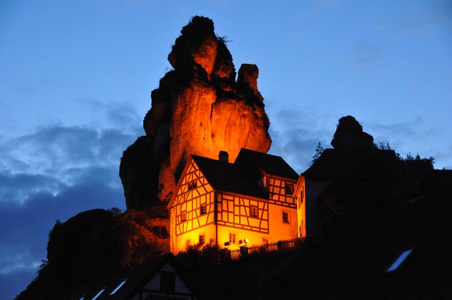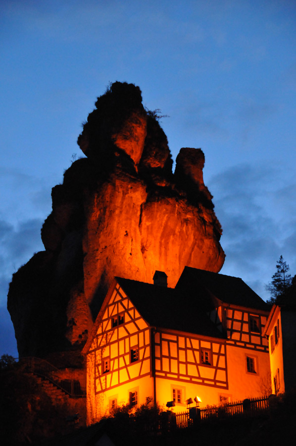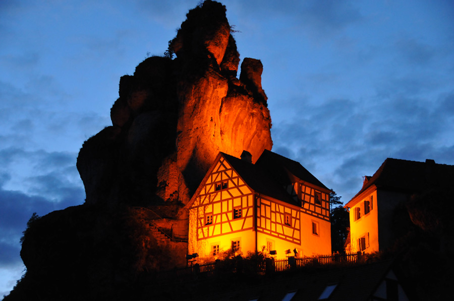 Als wir später am Abend noch einmal Tüchersfeld passieren, sehen wir einen Teil des Judenhofs und den dazugehörigen Felsen nächtlich erleuchtet. Da kaum Wolken am Himmel sind und die Sonne noch nicht komplett untergegangen ist, ergibt die Szenerie ein herrliches Foto. Nun wird es allerdings Zeit, sich dringend um eineUnterkunft zu kümmern.