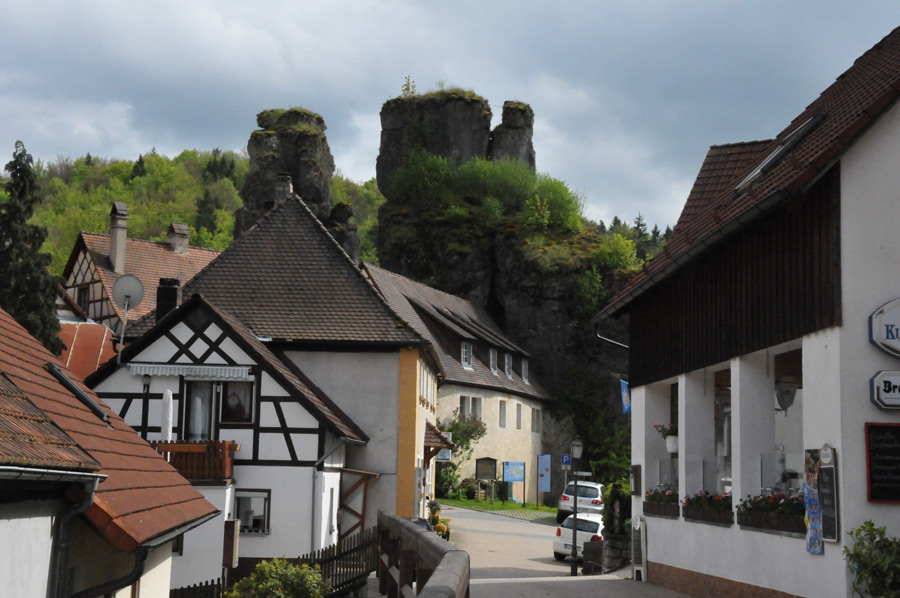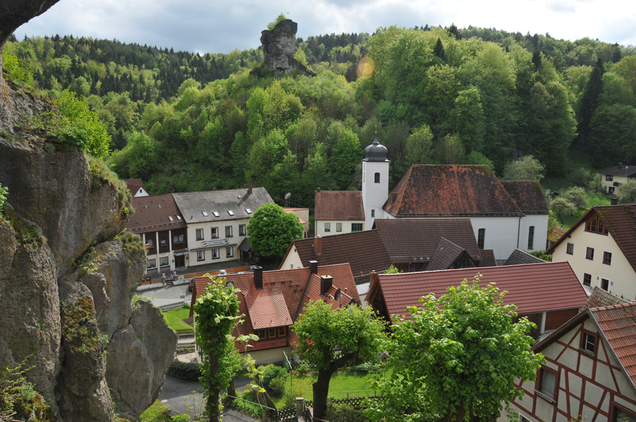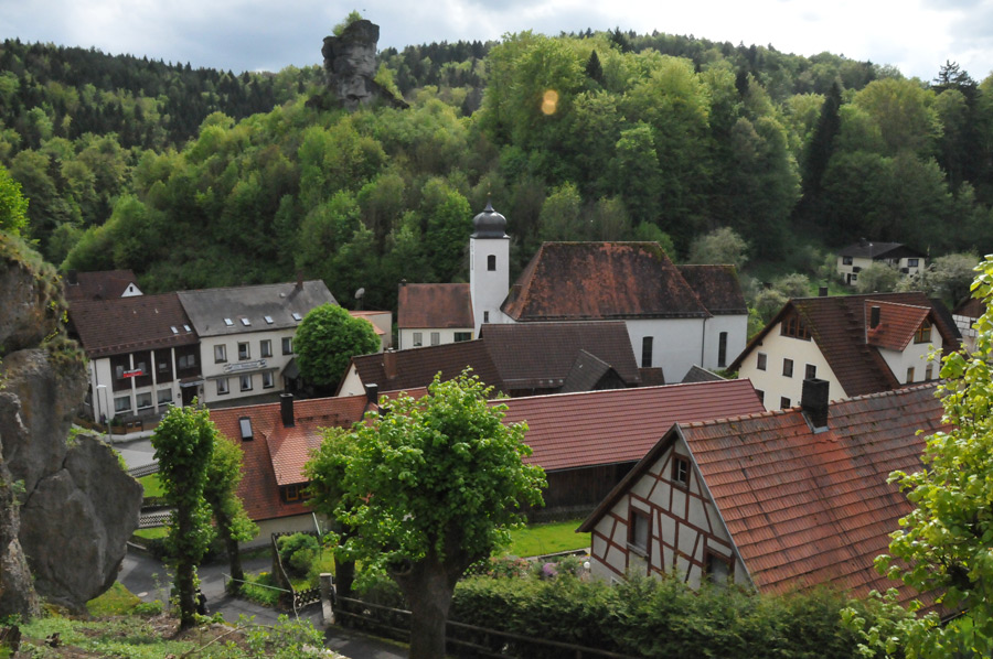 Am späten Vormittag machten wir uns von Albertshofen kommend auf den Weg. Zunächst Richtung Ebrach ging es dann über Bamberg hinein in die Fränkische Schweiz. Als ersten Zielort hatten wir uns für Waischenfeld entschieden, wo wir auch nach einer Übernachtungsmöglichkeit fragen wollten. Es zeigte sich jedoch schnell, dass alle Pensionen und Unterkünfte, die wir uns vorab gegoogled hatten, längst von Wanderern, Motorradfahrern oder Mountainbikern ausgebucht waren. Wir waren doch etwas überrascht, denn mit so viel Ansturm auf die Fränkische Schweiz hatten wir einfach nicht gerechnet.