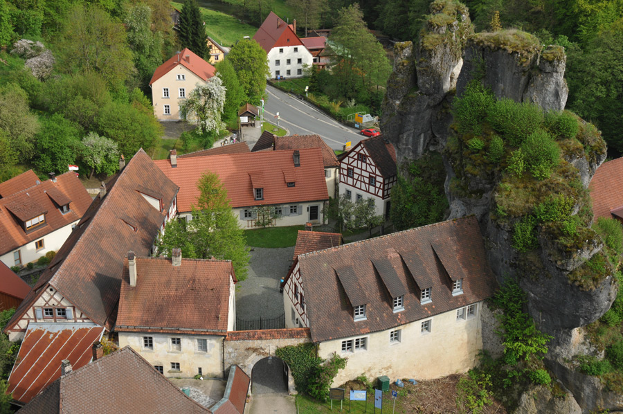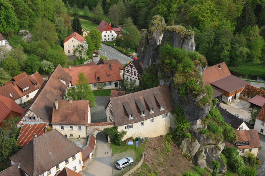 Von Waischenfeld aus befuhren wir dann die Staatsstraße 2191, die uns immer entlang der Wiesent durch das herrlich grüne Flusstal führte. Hier sind uns auch gleich die unzähligen Fliegenfischer aufgefallen, die entlang des Flusslaufs auf ihr Anglerglück hofften. Es war interessant zu beobachten, wie geschickt sich die hier ausschließlich aus Männern bestehenden Fliegenfischer im Auswerfen der Angelschnüre verhielten. Uns faszinierte die Geschicklichkeit, auf die wir deshalb in einem gesonderten Artikel noch Bezug nehmen wollen. An der Behringersmühle bogen wir dann nach links auf die 470 nach Tüchersfeld im Püttlachtal ab. Für alle Naturliebhaber oder Wanderer sei gesagt, das sich direkt gegenüber der Abzweigung ein großer Parkplatz befindet, von dem aus die Ortsmitte gut zu erreichen ist. Wer sich zunächst einen Überblick über den Ort verschaffen möchte, dem sei der Höhenwanderweg empfohlen, der vom Parkplatz aus auf eine Aussichtsplattform über der Ortschaft Tüchersfeld führt. In knapp 15 Minuten hat man den Aussichtspunkt erreicht, der einen herrlichen Blick auf den sogenannten „Judenhof“ ermöglicht, dem wohl interessantesten Gebäudeensemble in Tüchersfeld mit kleinem Museum, aufgeteilt auf die verschiedenen Gebäudeteile.