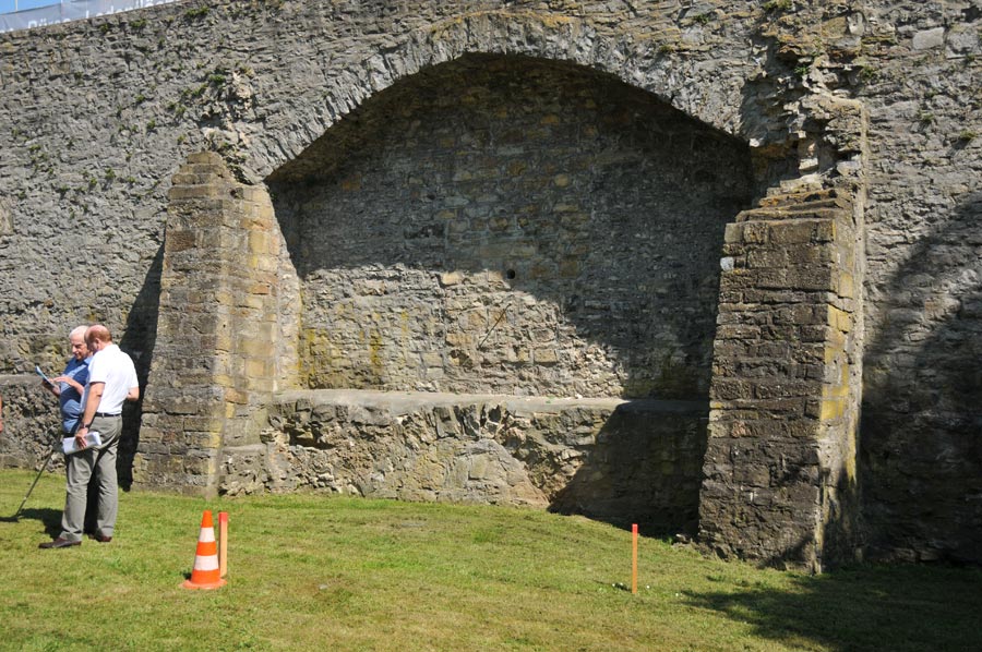 Treffpunkt war der Theaterpark am so genannten Höpperle, einem einst aufgeschütteten Weg zwischen den Stadtmauerteilen. Manchmal wird der nicht mehr vorhandene Turm, der hier einst gestanden hat, auch mit Höpperle Turm bezeichnet, was allerdings historisch betrachtet falsch ist. In diesem Mauerabschnitt gab es einst 7 Türme, die namentlich bekannt sind. Das Hochbauamt hatte extra für diesen Ortstermin zwei der ehemaligen Turmstandorte markiert. Deutlich sind die beiden seitlichen Pfeiler, die auch die beiden Seitenwände des Turms markieren, zu erkennen. Dazwischen gab es eine heute zugemauerte Bogenöffnung, die einst als Ausfallöffnung fungierte, entsprechend hieß dieses Stadttor mit Turm "Ausfall-Turm". Diesen Turm möchte Peter gern wieder errichten lassen, um damit auch dem Theaterpark wieder ein wenig Historie zurück zu geben. Leider sind bislang keine Bilder des Ausfall Turms bekannt. In Richtung der Kunsthalle gab es allerdings den baugleichen "Schweinehirten-Turm", von dem Bilder vorhanden sind.